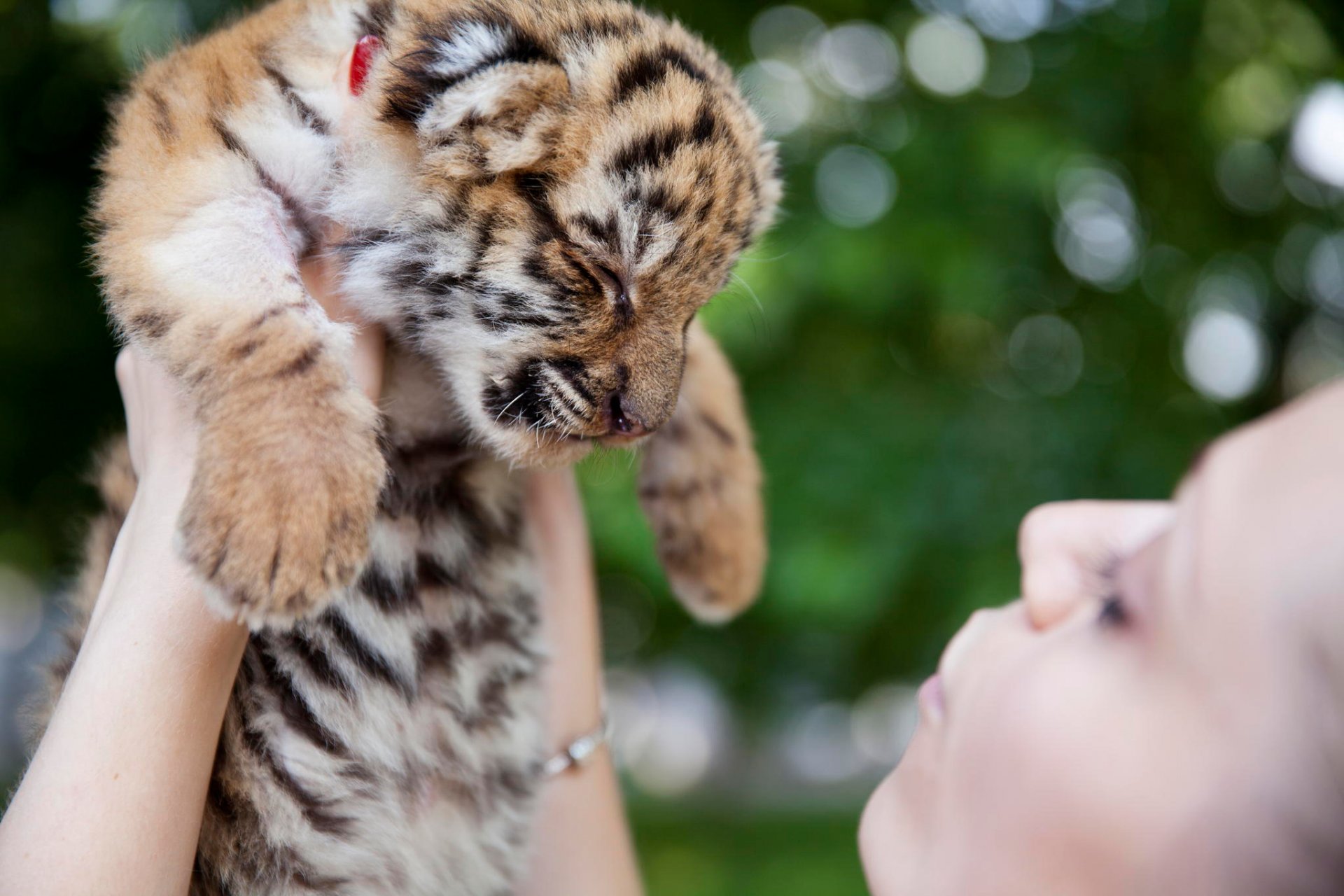 Hecho a mano casero cachorro de tigre en las manos de una niña