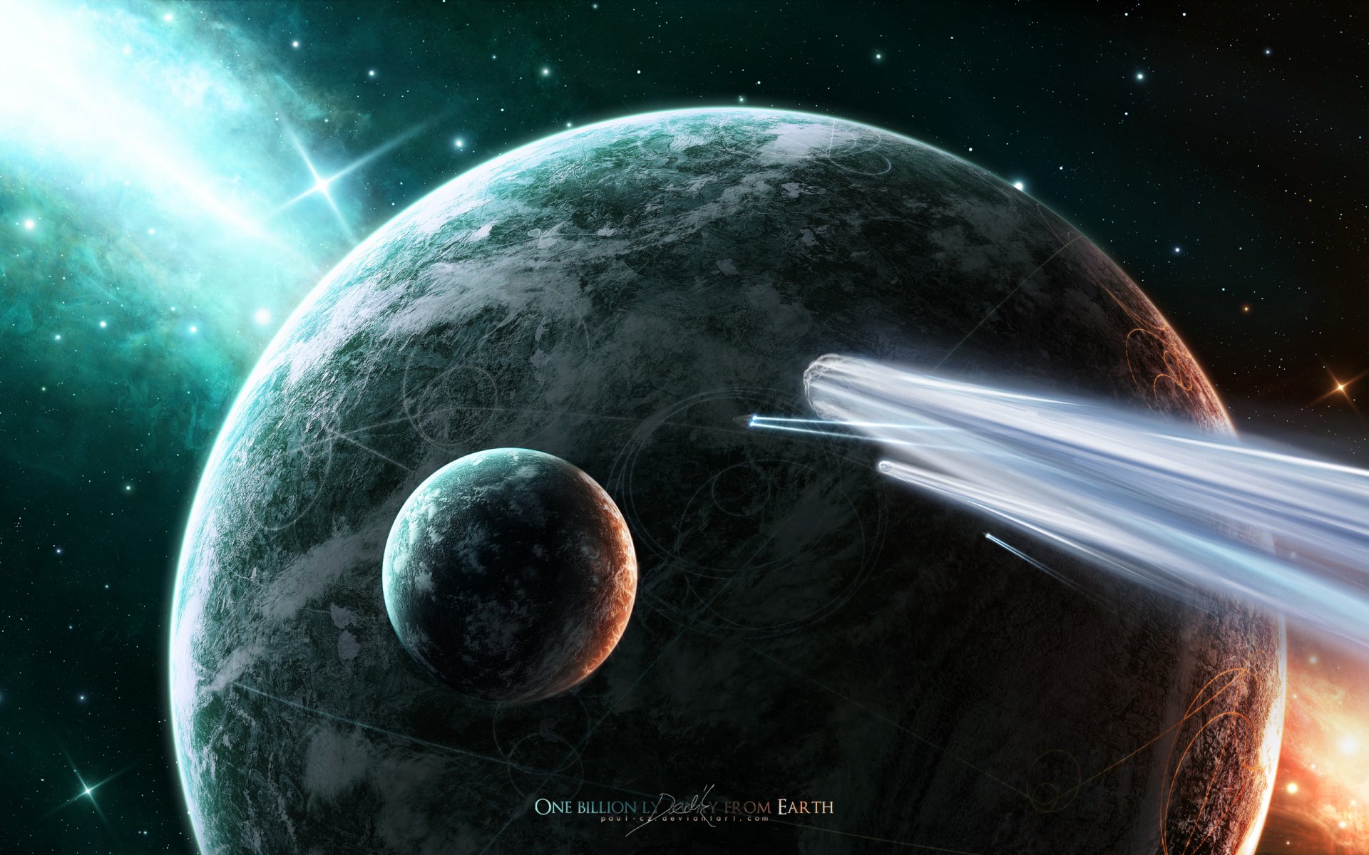 Planeta pequeño en el fondo grande y una estrella en la separación