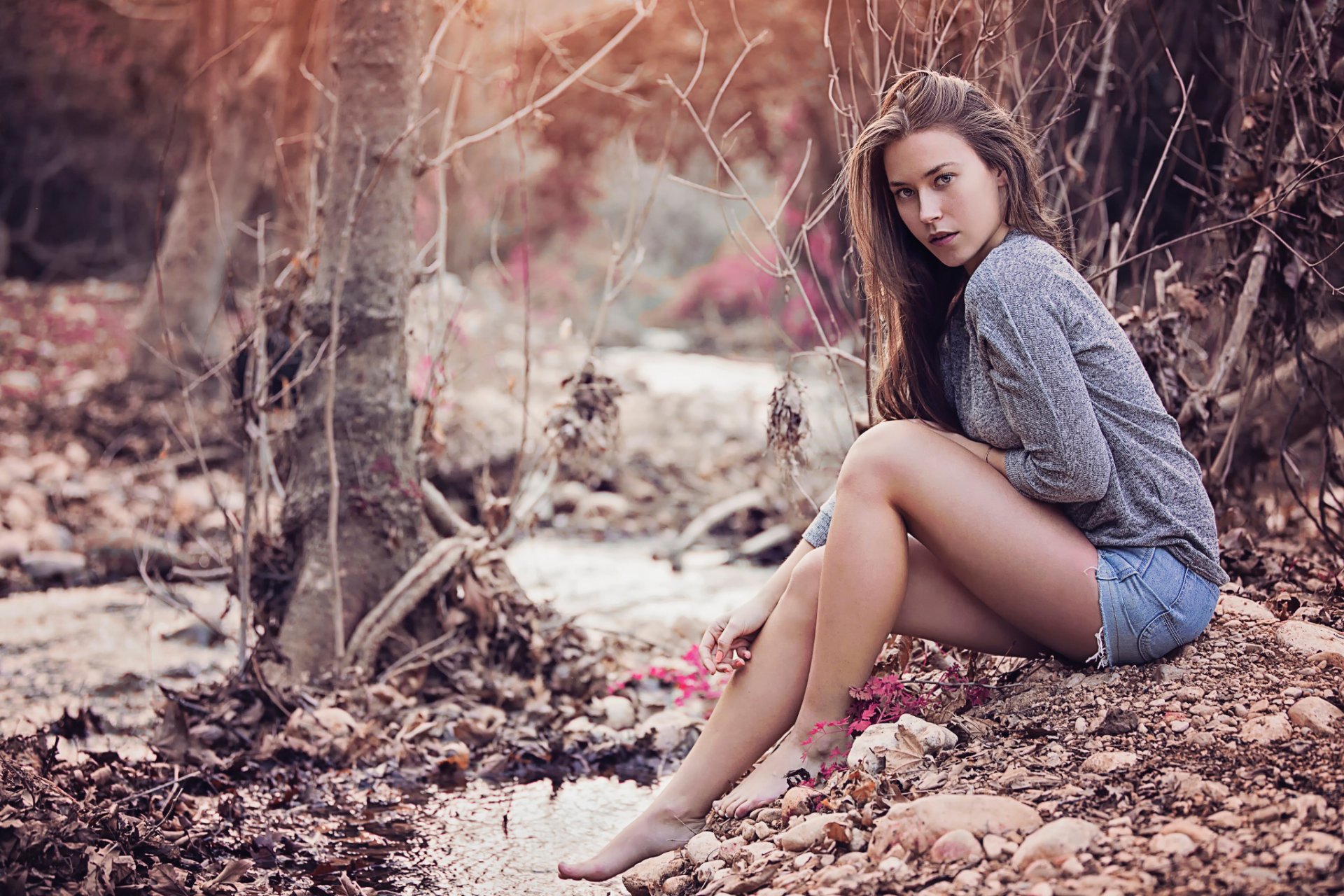 Chica en pantalones cortos se sienta en las rocas en el bosque