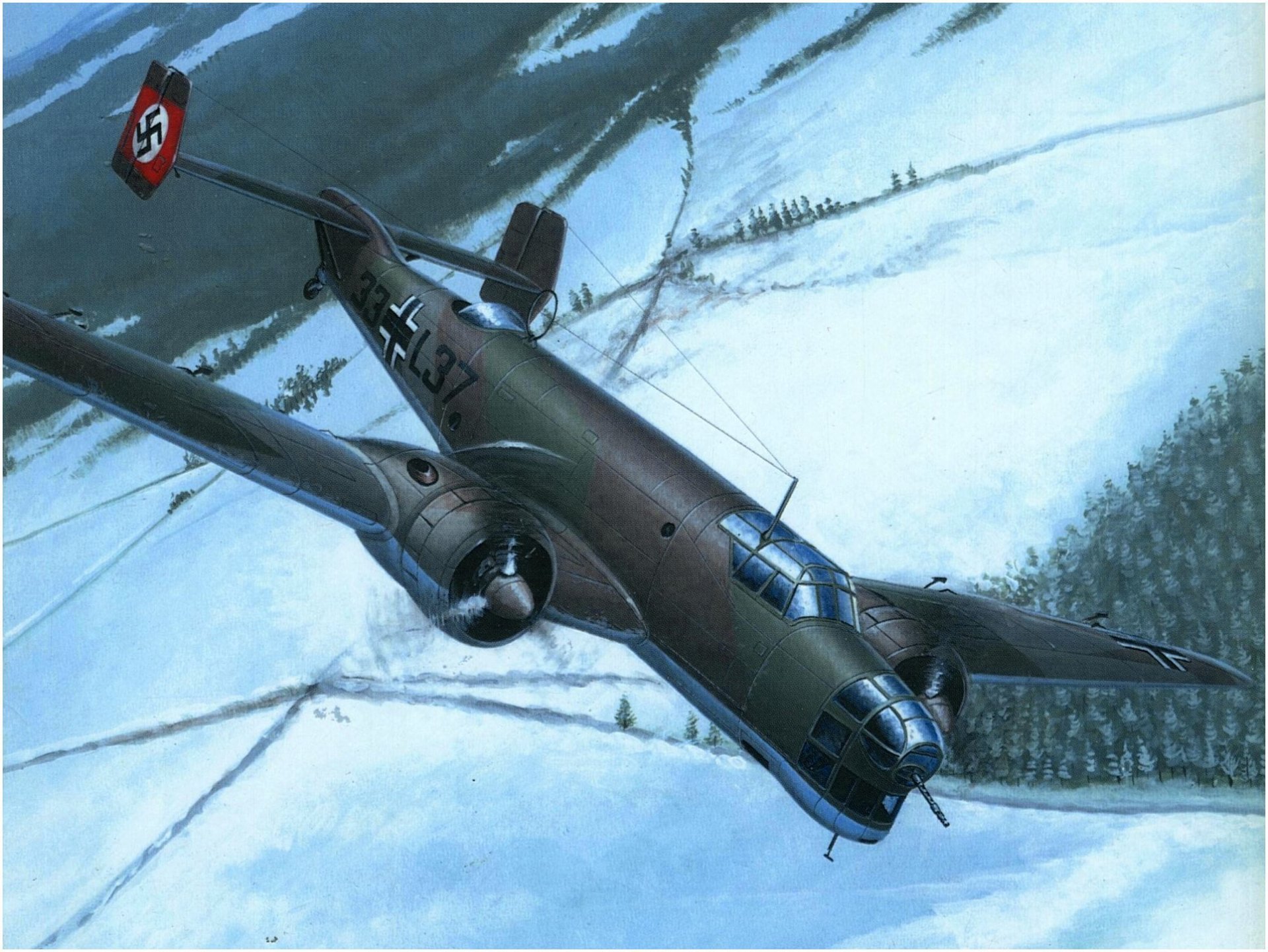 Dibujo de un avión alemán sobre un terreno nevado