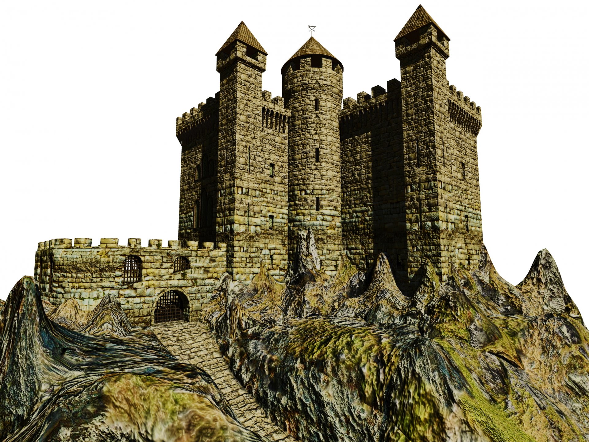 Un lugar fantástico con figuras de piedra en la niebla
