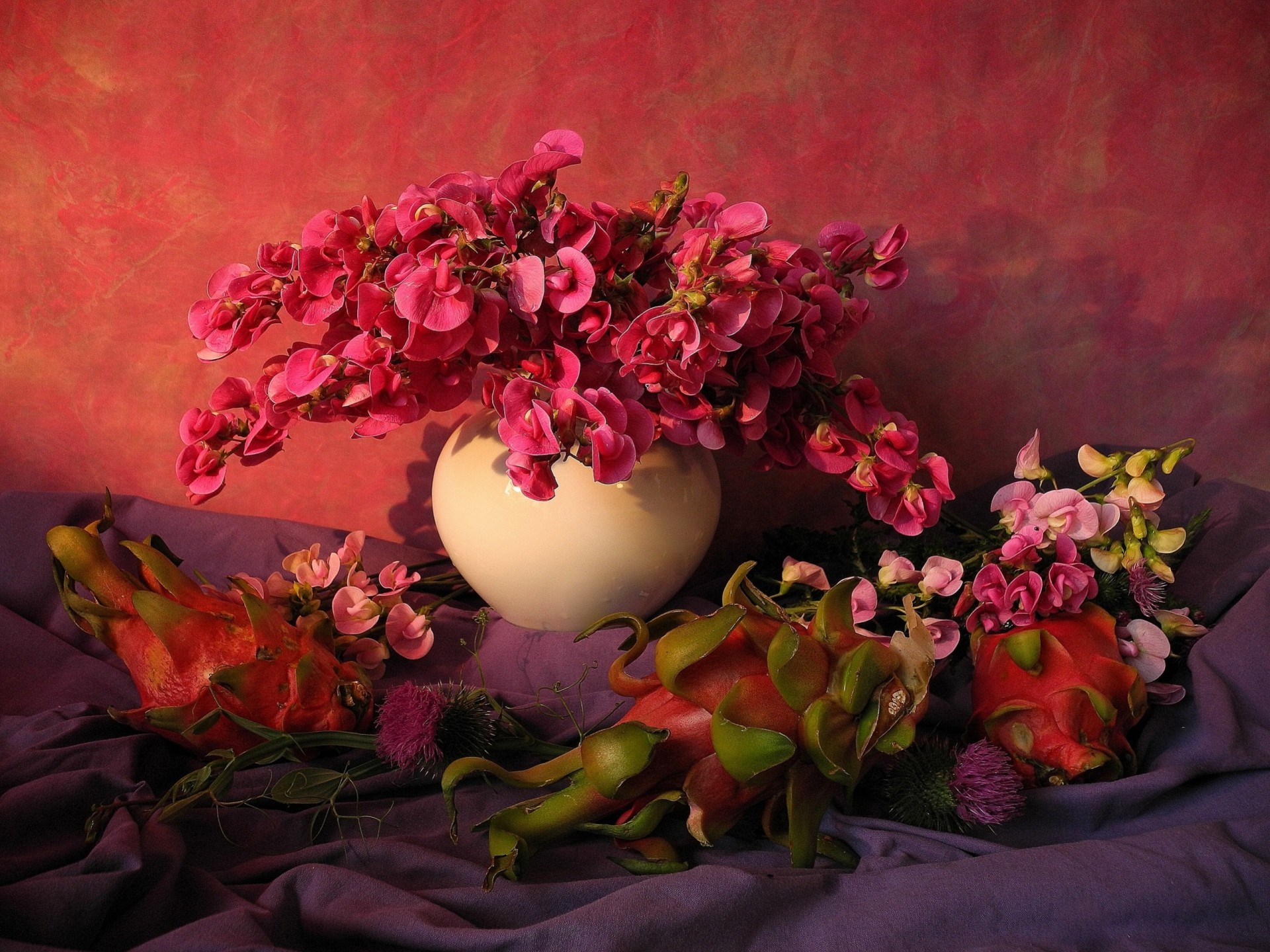 Naturaleza muerta con frutas y flores sobre un fondo rojo