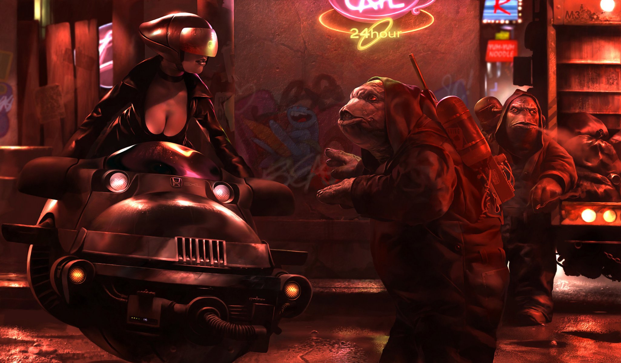 Imagen futurista de una niña en una motocicleta y un monstruo