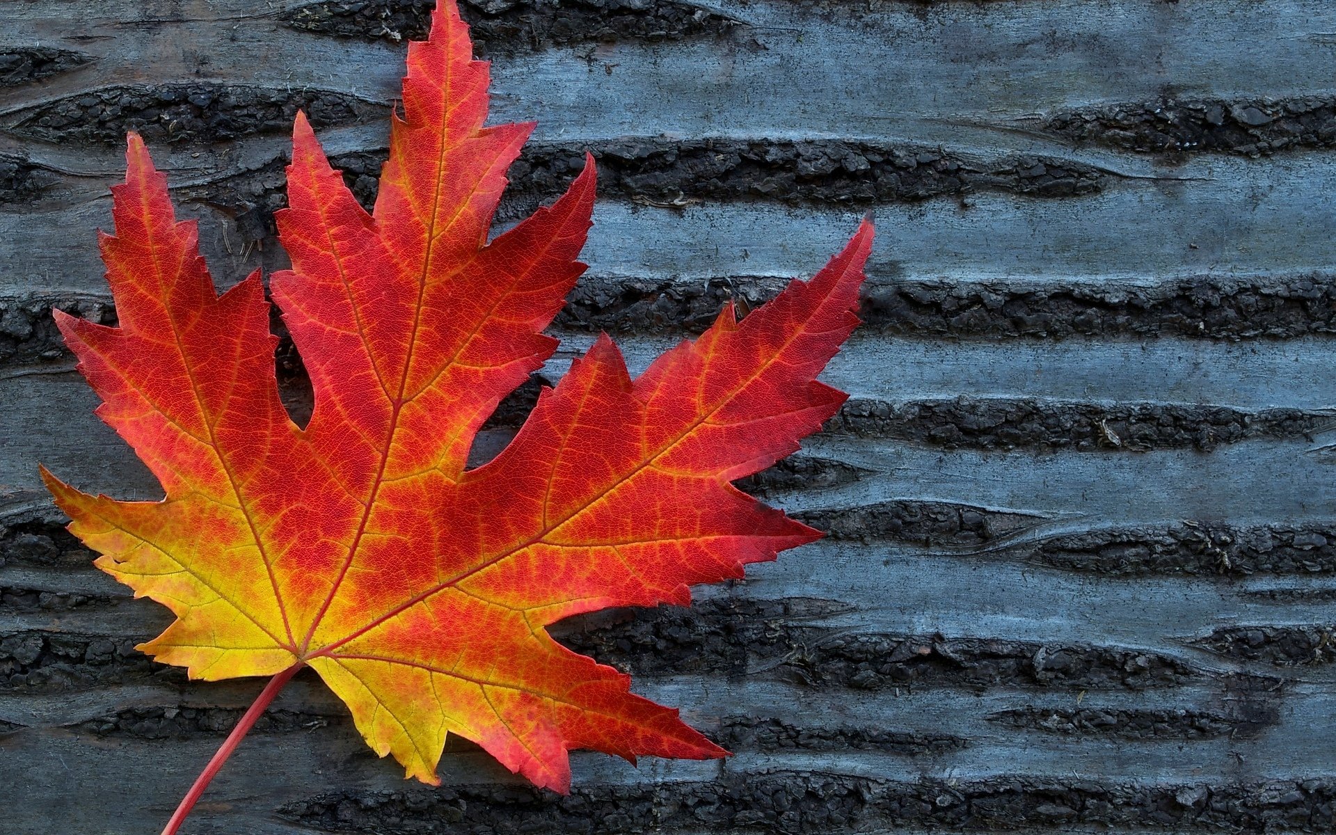 Hoja de arce rojo contra el fondo del árbol