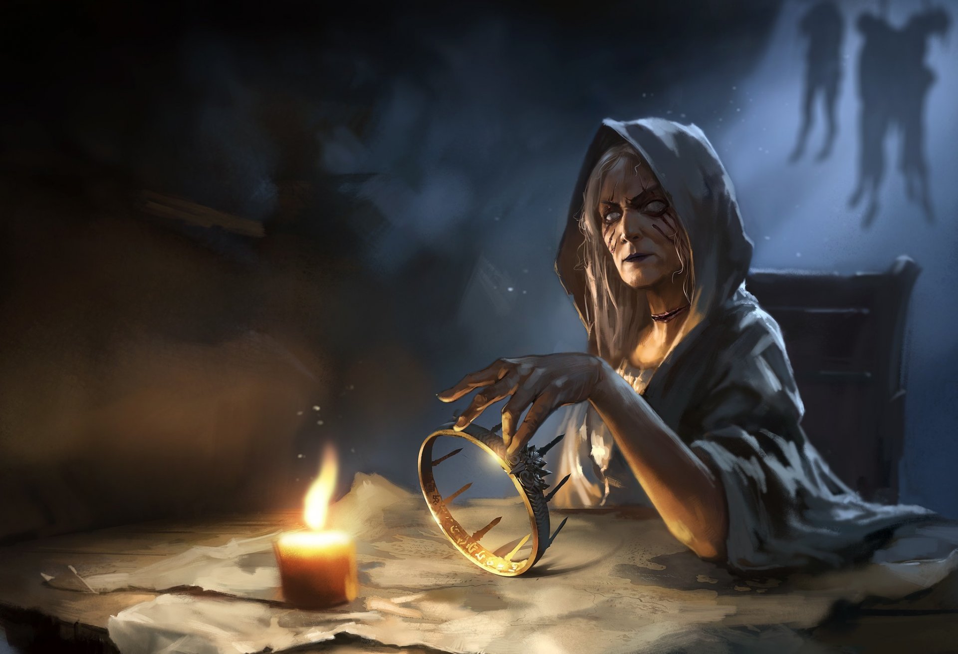 Chica-hechicera con un bastón en sus manos y criaturas mágicas