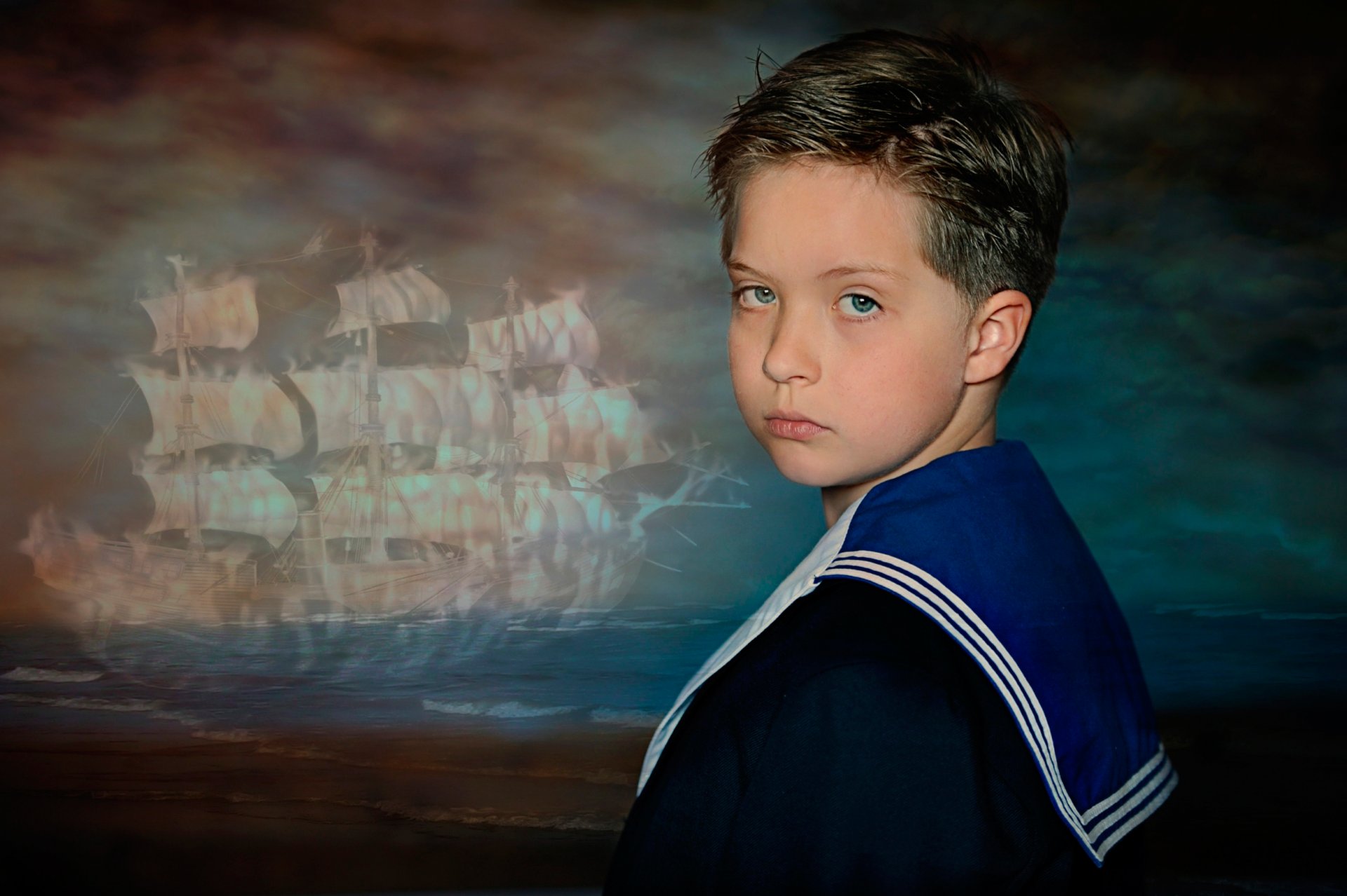 Joven marinero en el fondo de la pintura "velas escarlatas"