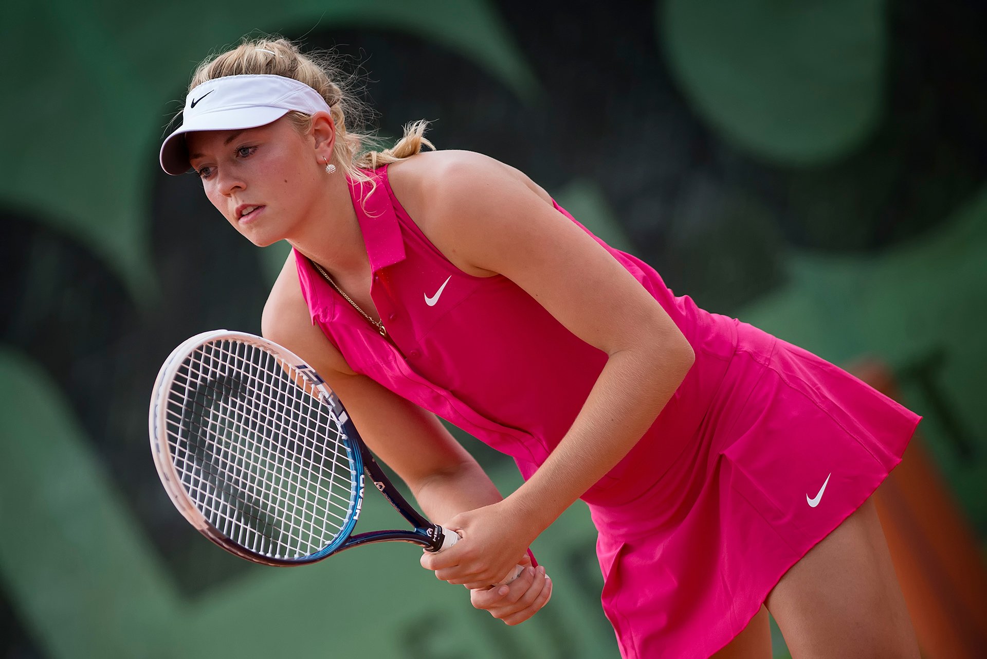 Karina de ojos marrones en un vestido blanco en la orilla rocosa
