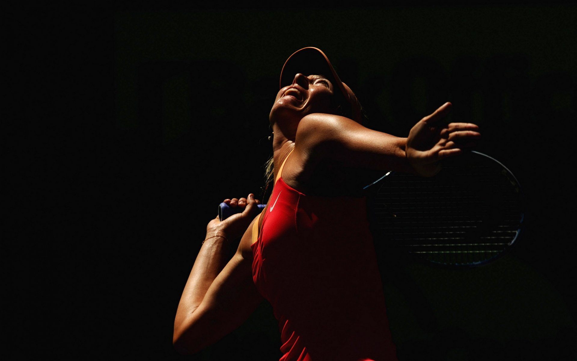 Maria Sharapova con una raqueta en el juego. Tenista con raqueta patea la pelota