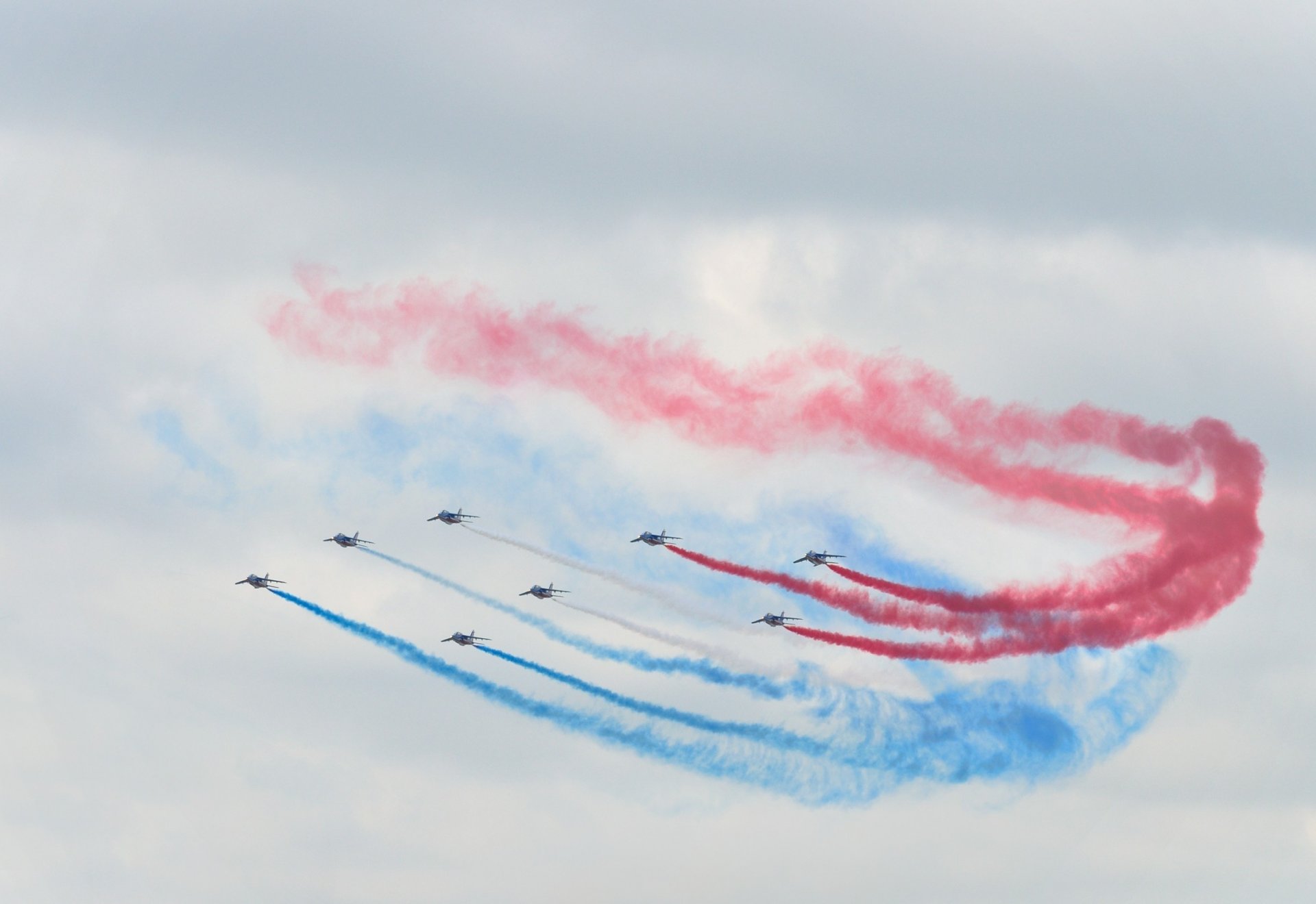 Aviones Max 2009 dejan humo multicolor en el cielo