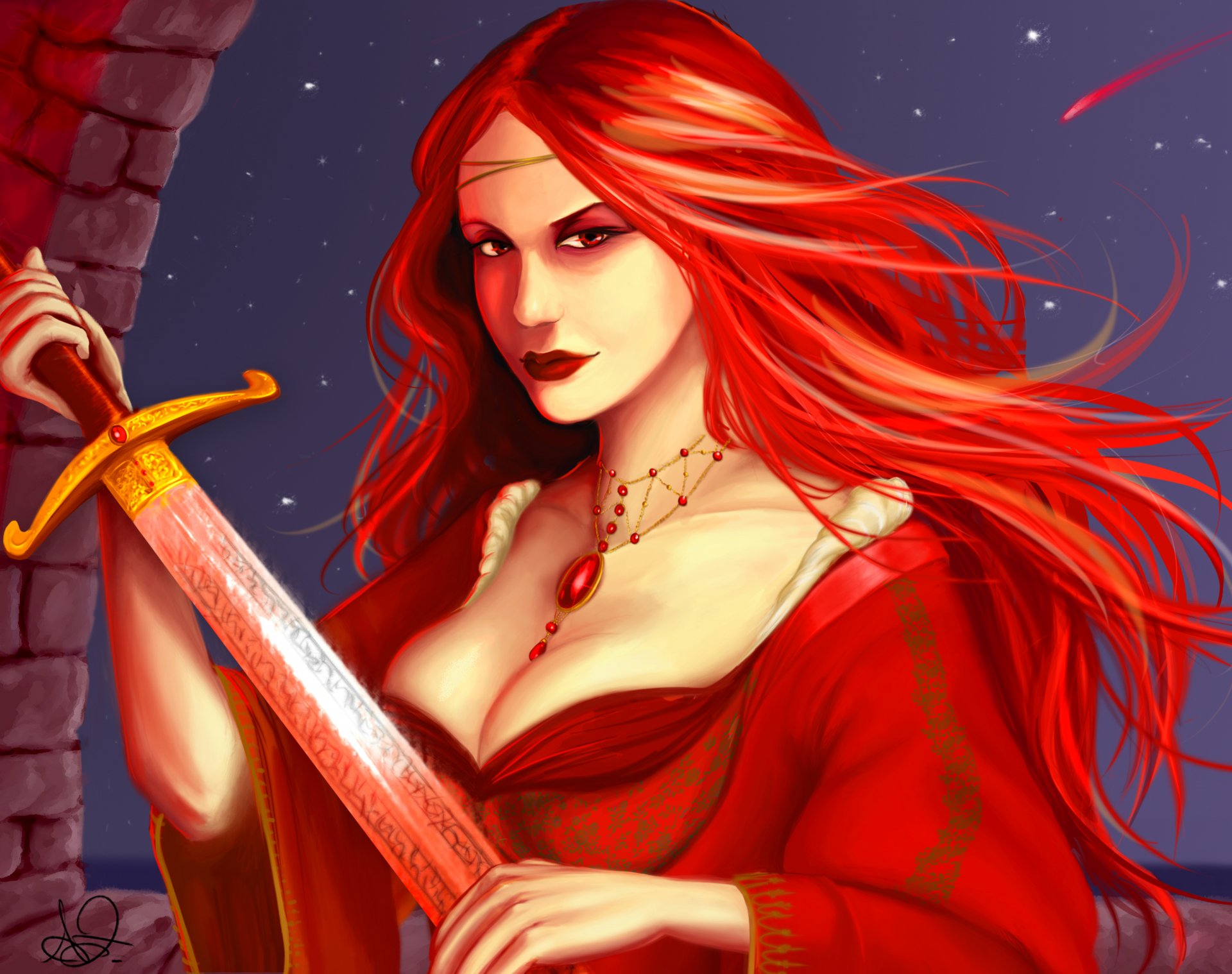 Mirada de la muchacha del pelo rojo con la espada
