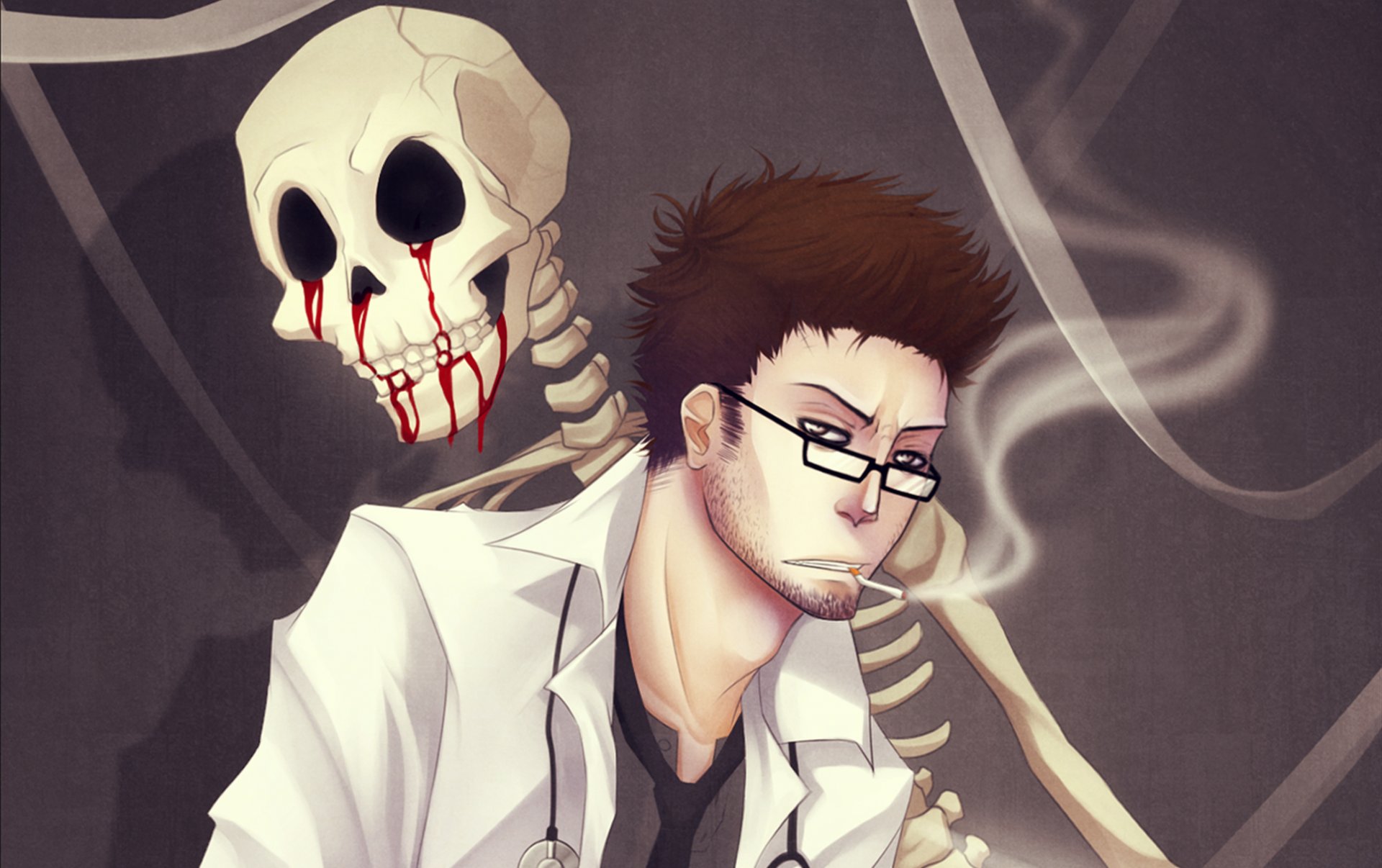 Hombre con gafas fuma y detrás de él esqueleto