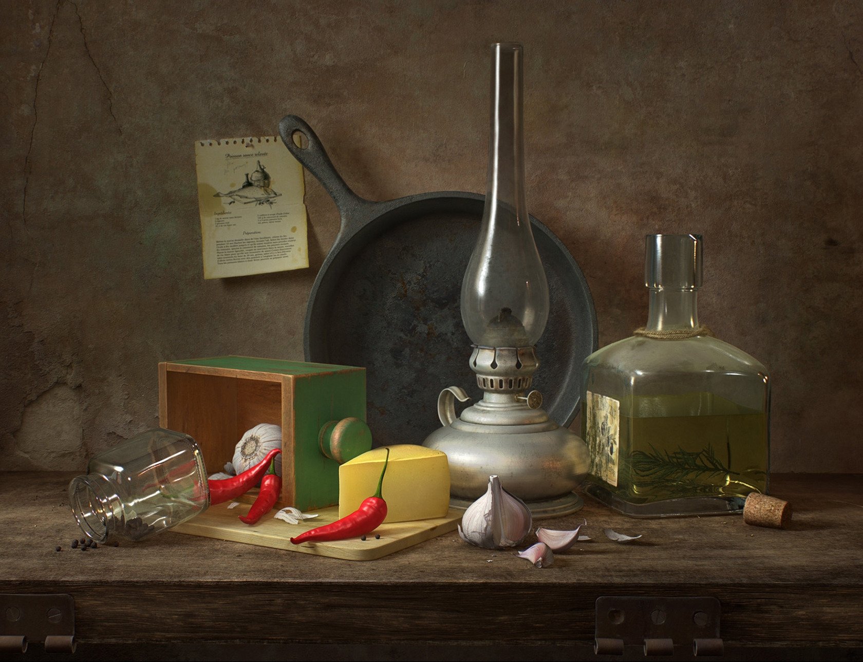 Naturaleza muerta con pimienta, sartén y lámpara de aceite