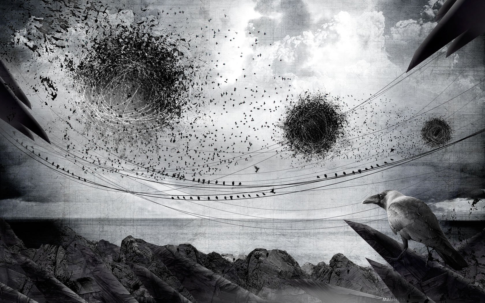 Enjambre de pájaros sombríos en el cielo sobre el páramo