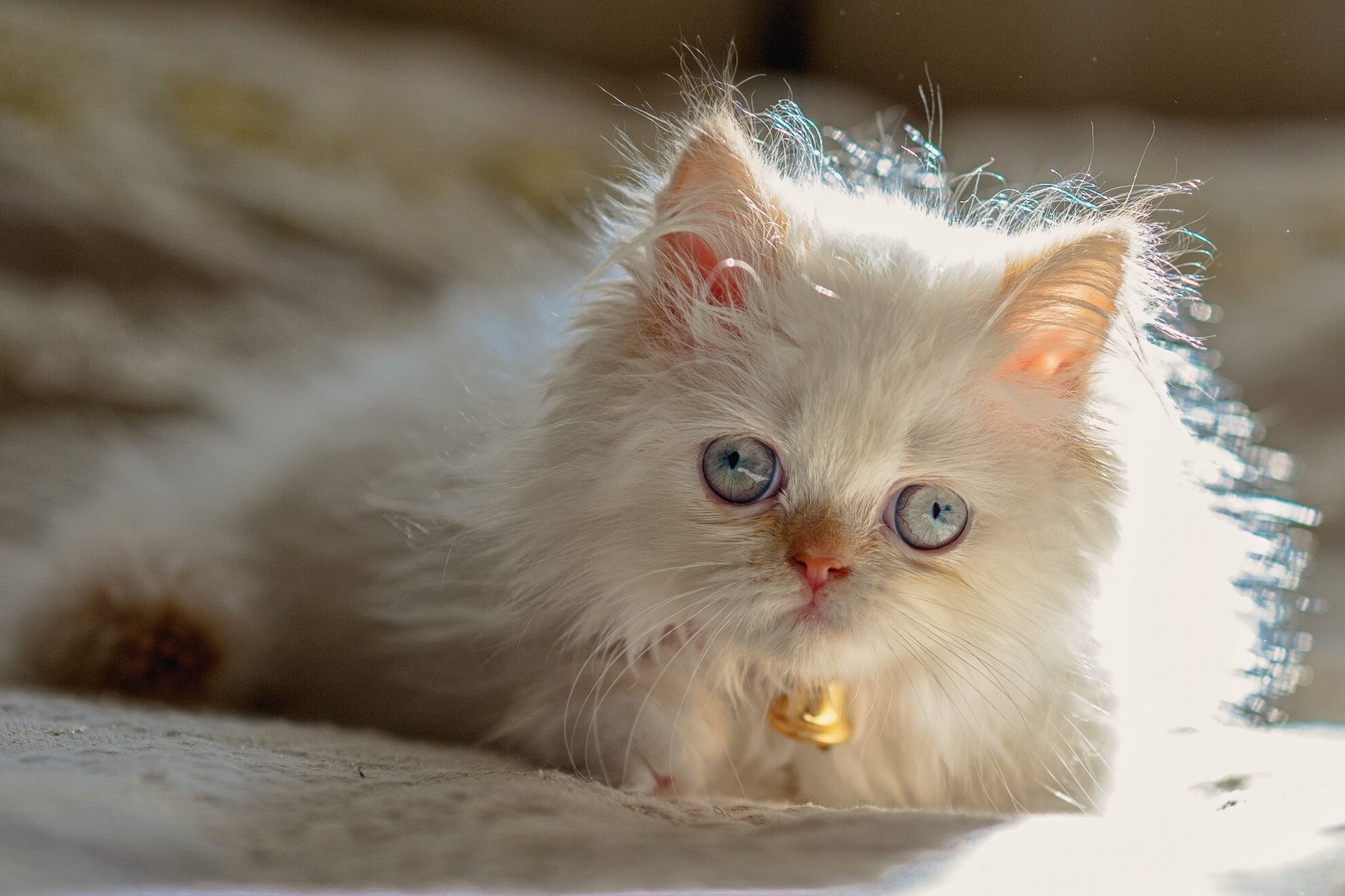 Gato blanco con ojos oblicuos y pandereta en el cuello