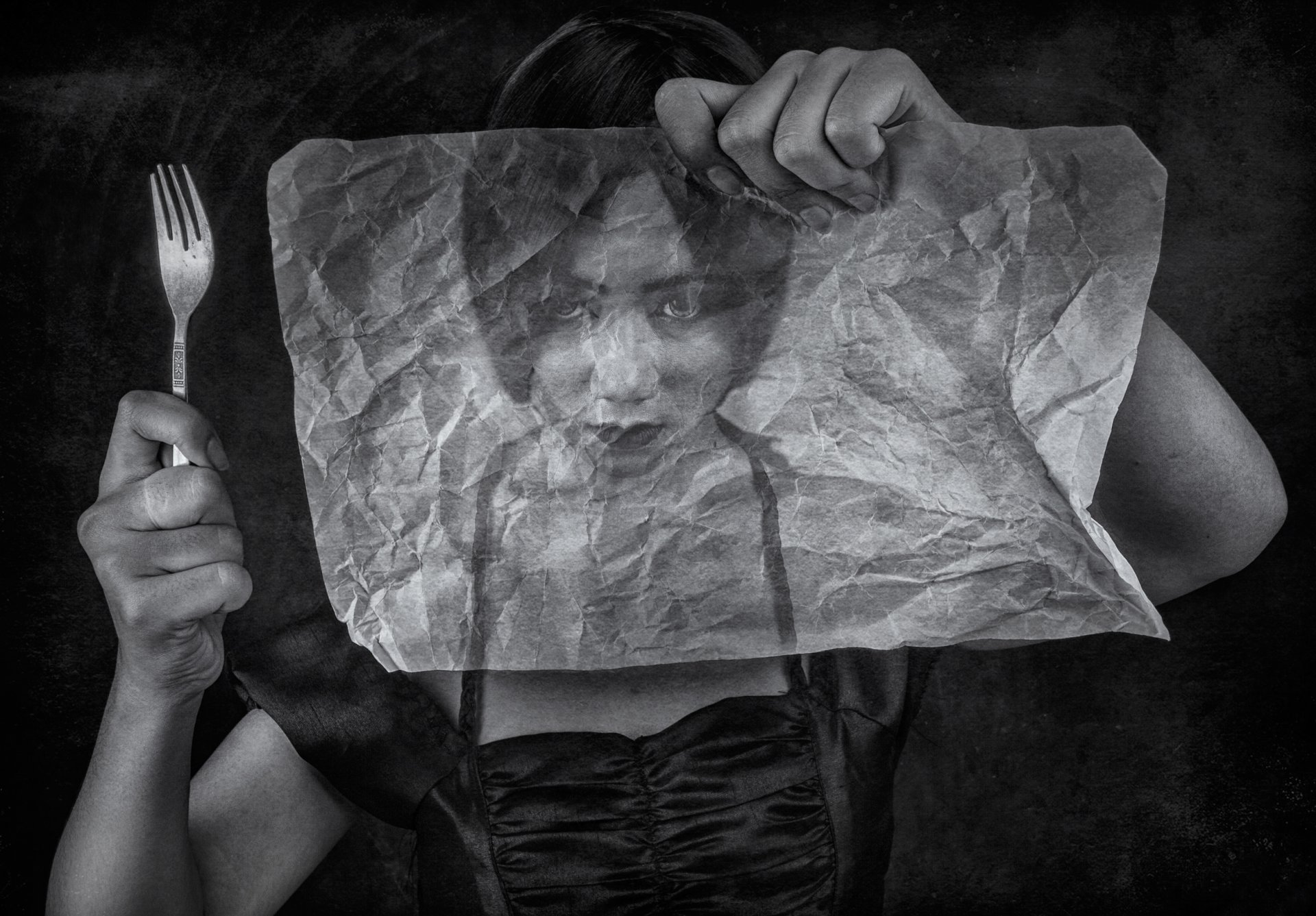 Imagen de una chica con un tenedor a través de papel de calco arrugado