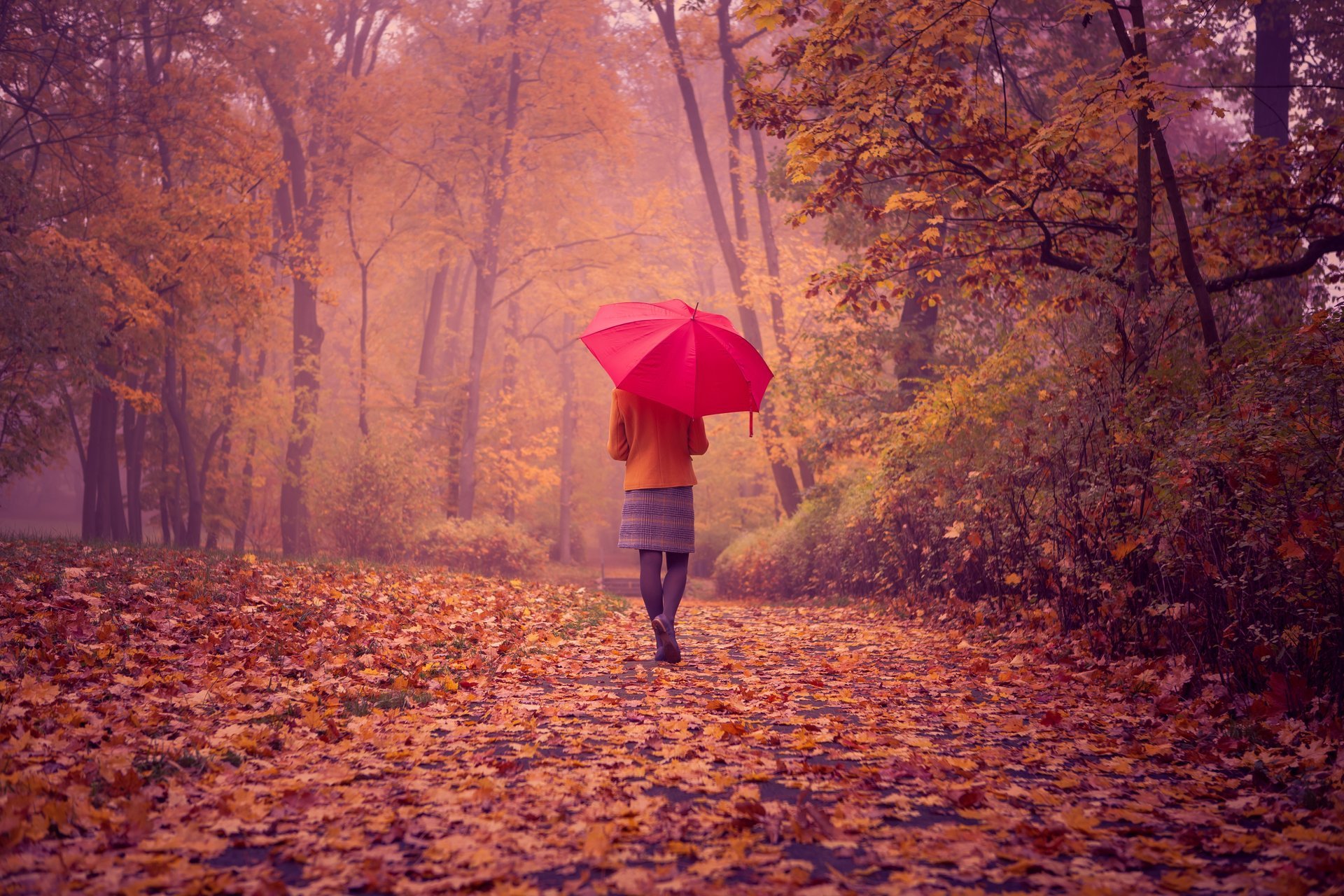 Morena en un largo vestido amarillo con un tren de paraguas rojo en sus manos contra el fondo de un bosque cubierto de nieve