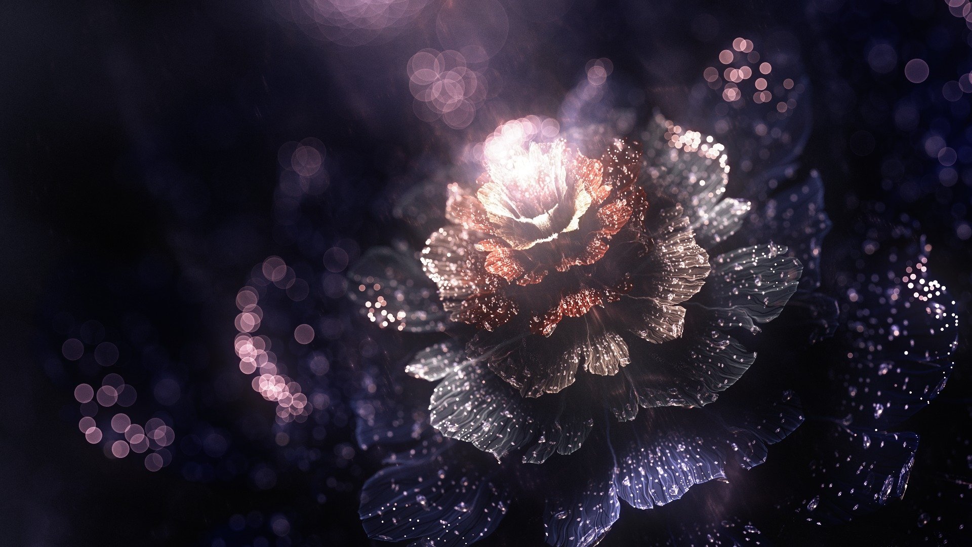 Pétalos luminosos con reflejos sobre fondo negro