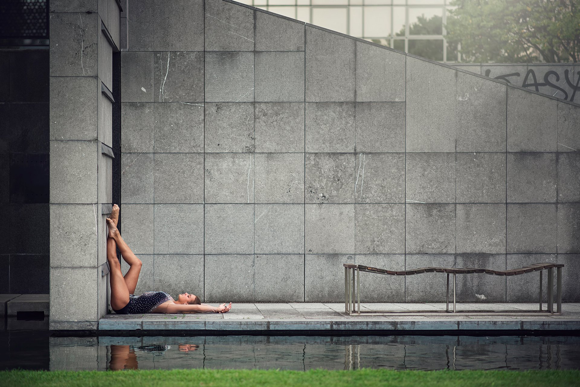Chica en vuelo hace cordel en el fondo de Fuentes y edificios