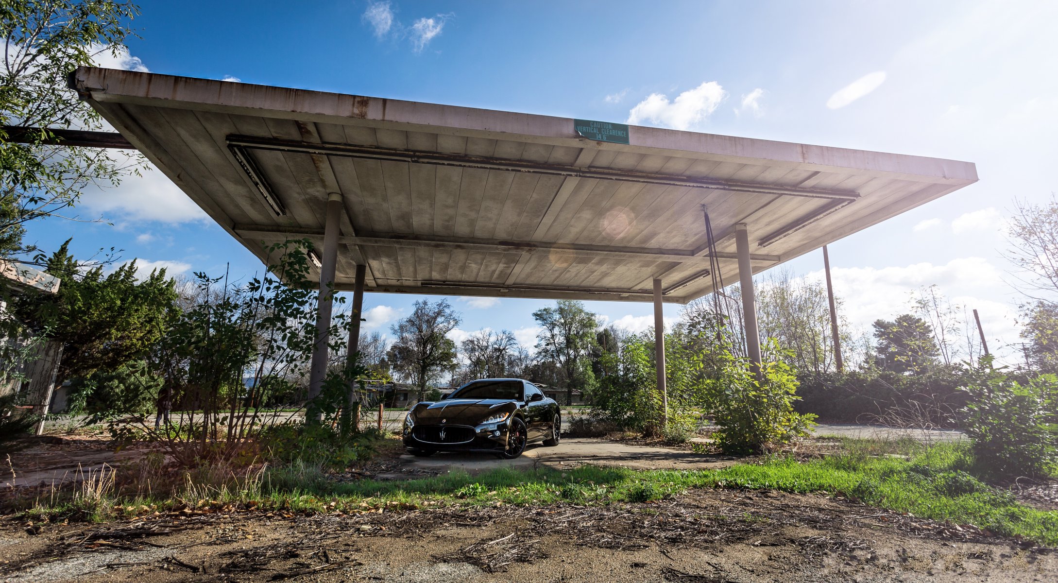 Maserati en la naturaleza de pie bajo un enorme dosel