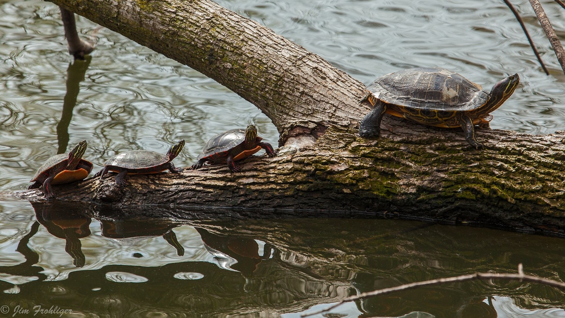 Tortuga pintada con cachorros arrastrándose fuera del agua