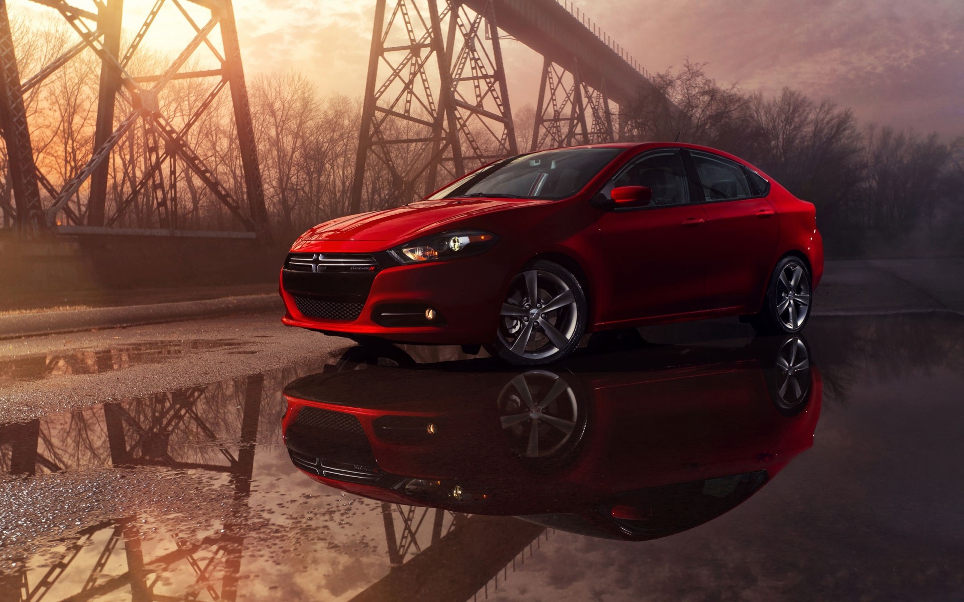 Coche deportivo rojo en la carretera en charcos después de la lluviaCoche deportivo rojo en la carretera en charcos después de la lluvia