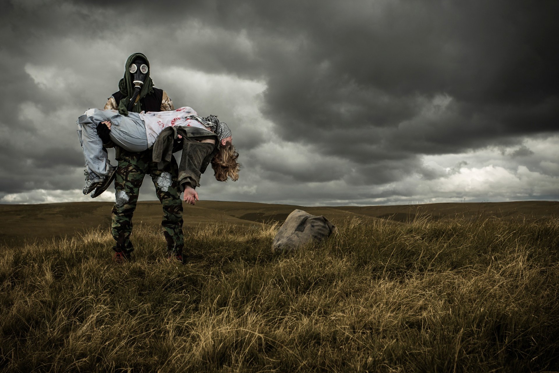Chica en una máscara de gas con las piernas desnudasChica en una máscara de gas con las piernas desnudas