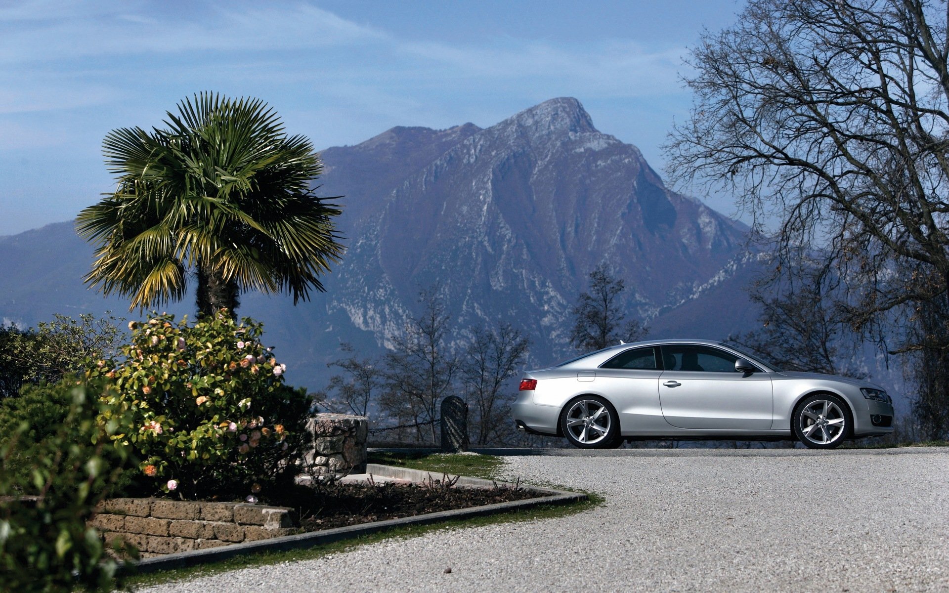 El audi gris se encuentra en el fondo de las montañasEl Audi gris se encuentra en el fondo de las montañas