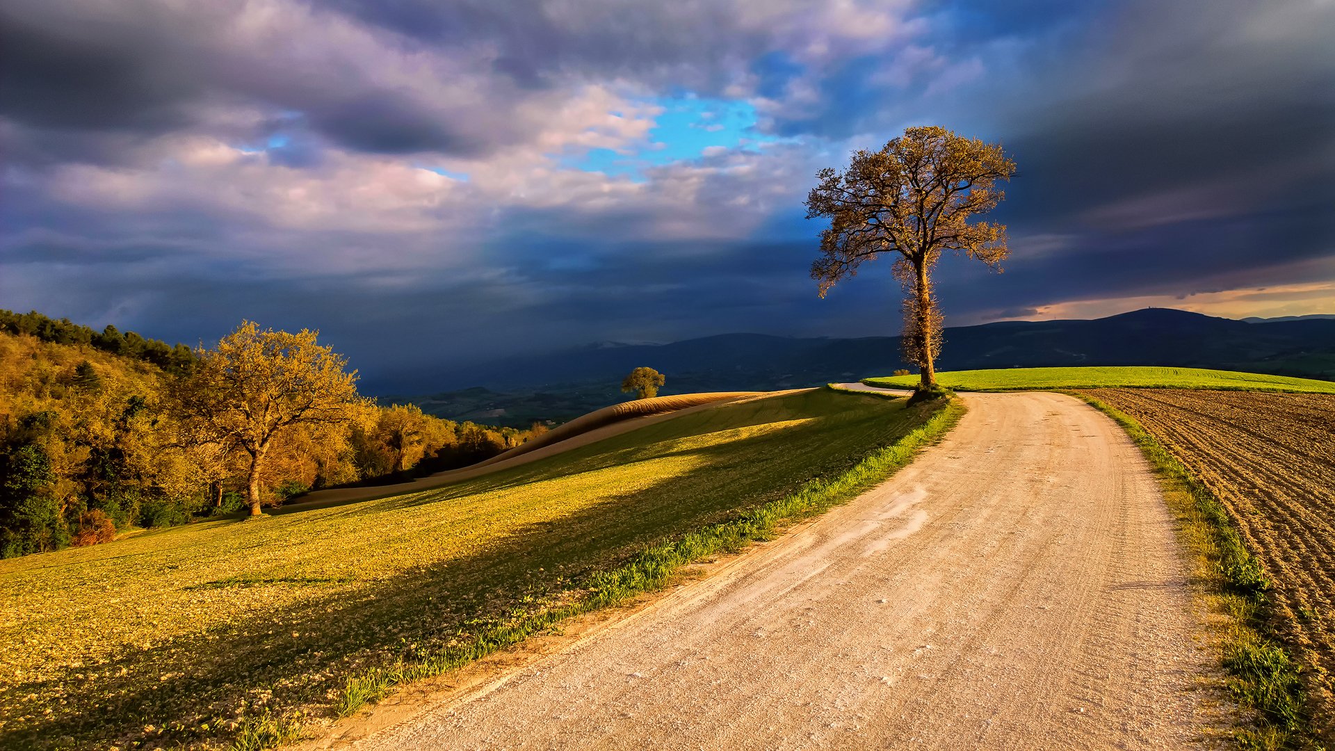 Nubes negras y pesadas arrastran el cielo sobre campos verdes lisos