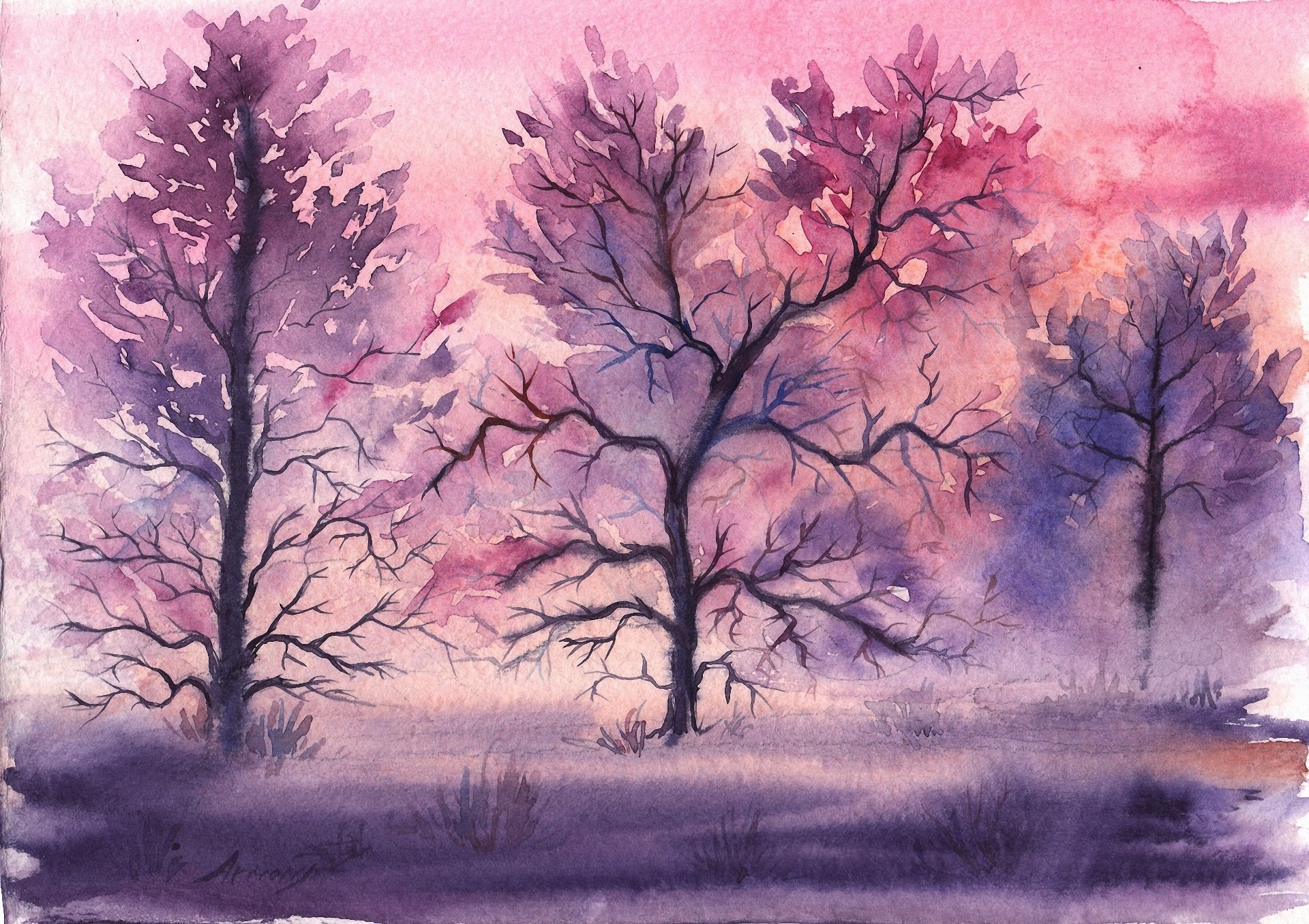 Paisaje de acuarela del río otoñal junto al bosque, todo en rosa púrpuraPaisaje de acuarela del río otoñal junto al bosque, todo en rosa púrpura