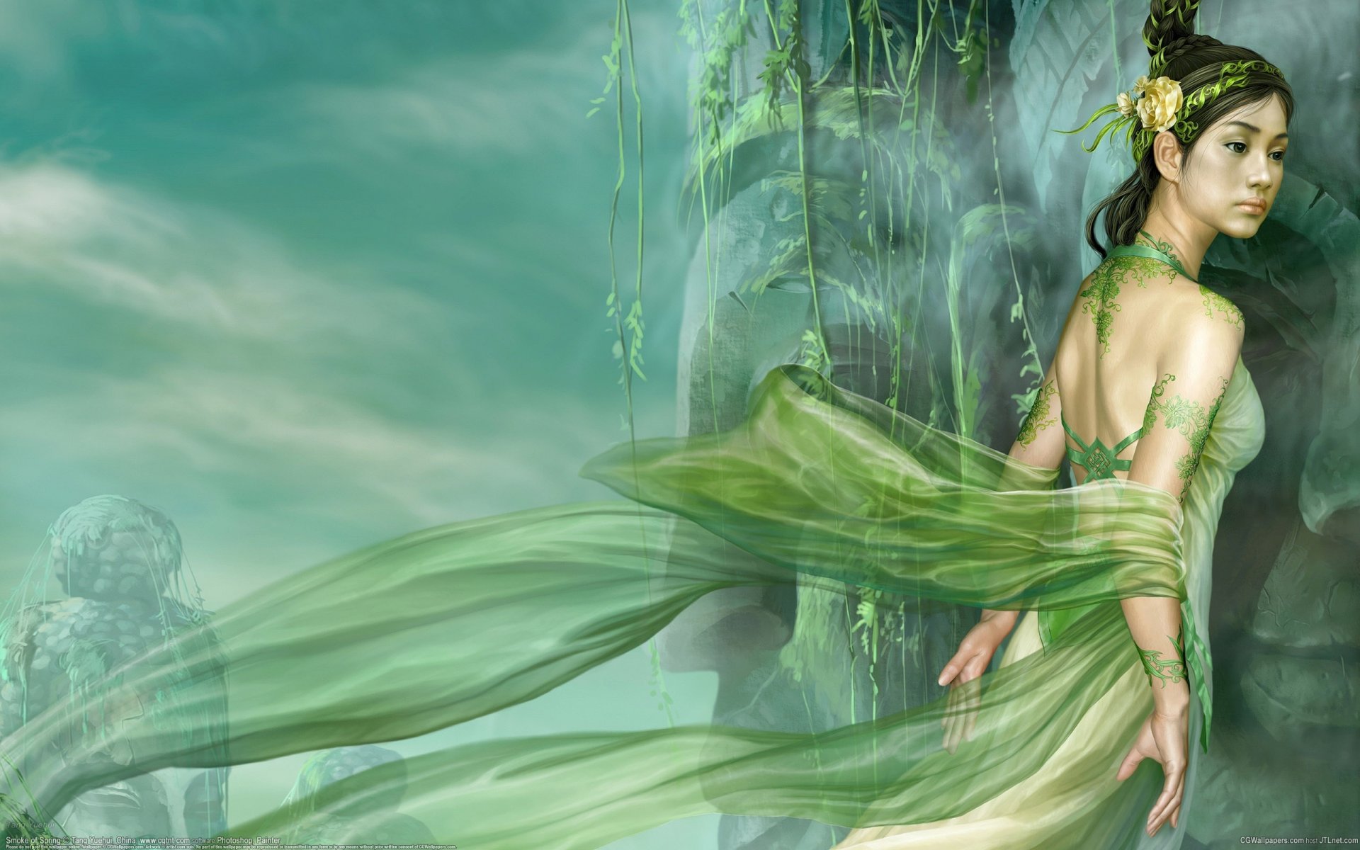 Hermosa chica del bosque en un vestido verde, alrededor de la nieblaHermosa chica del bosque en un vestido verde, alrededor de la niebla
