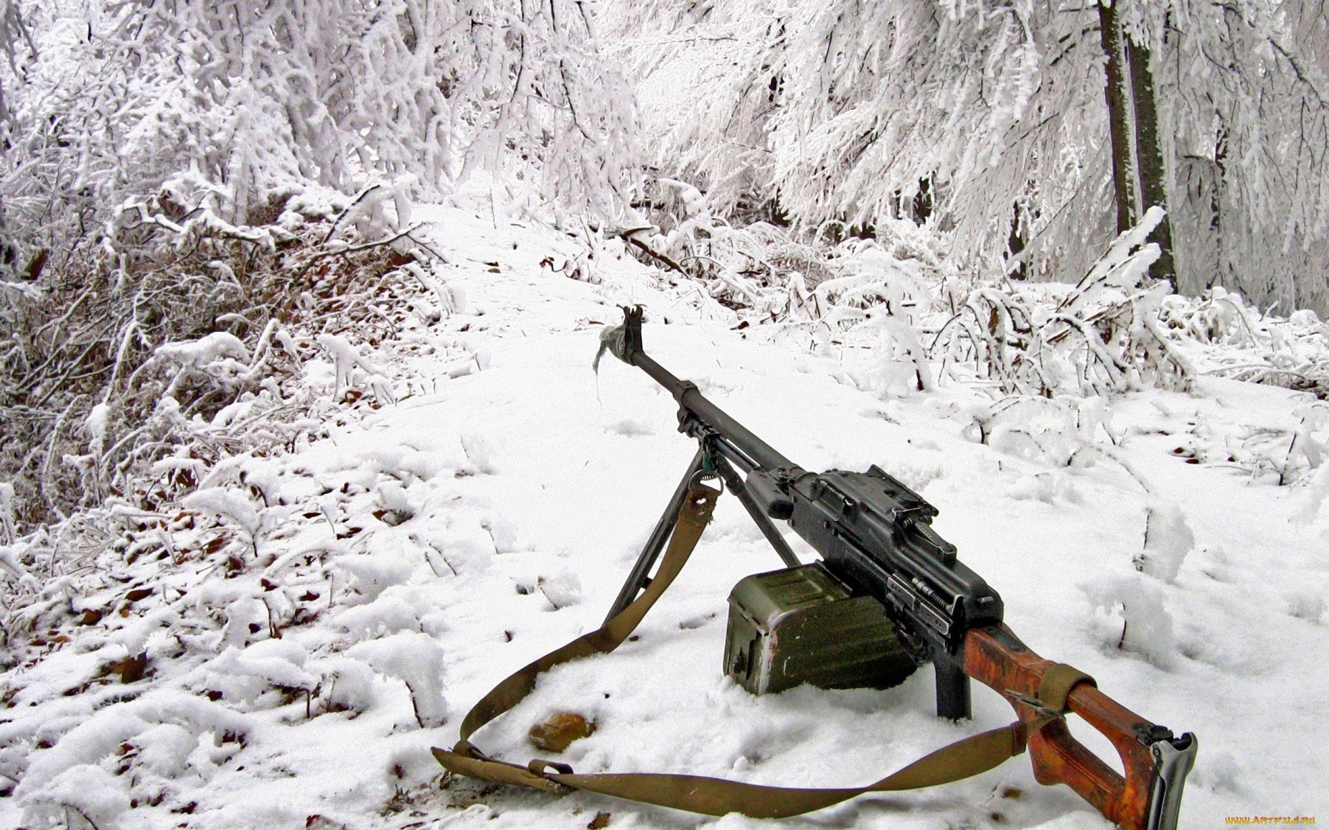 Ametralladora en el fondo de un sendero de montaña cubierto de nieveAmetralladora en el fondo de un sendero de montaña cubierto de nieve