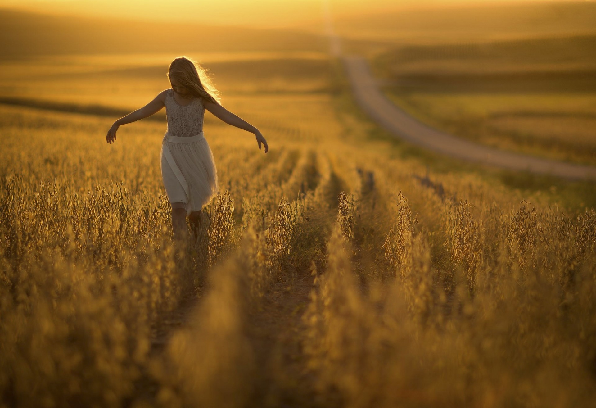 Niña feechka lleva una flor estrellada caminando por el camino naranja