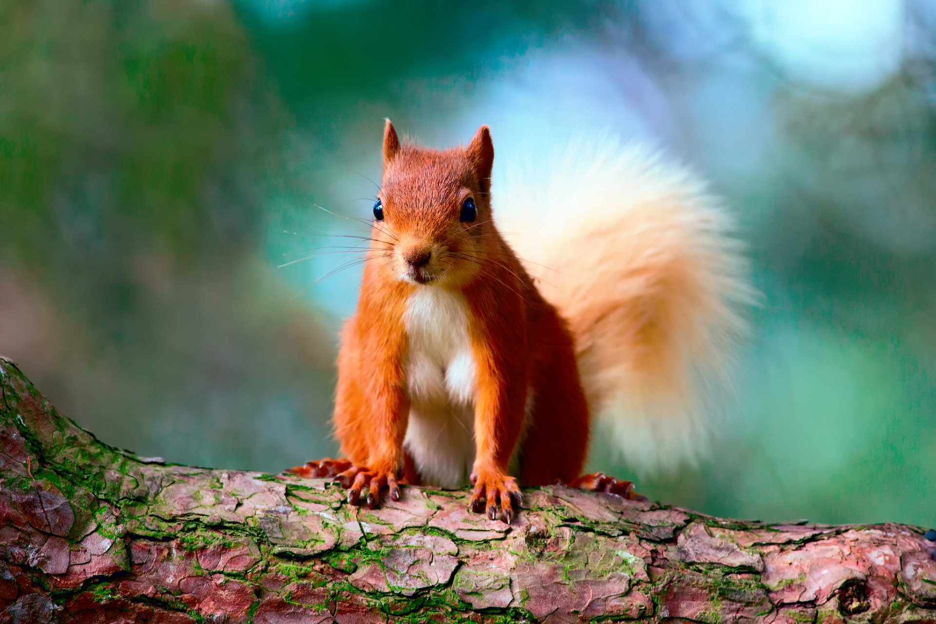 Ardilla con la cola en la espalda se sienta en una tablaArdilla con la cola en la espalda se sienta en una tabla