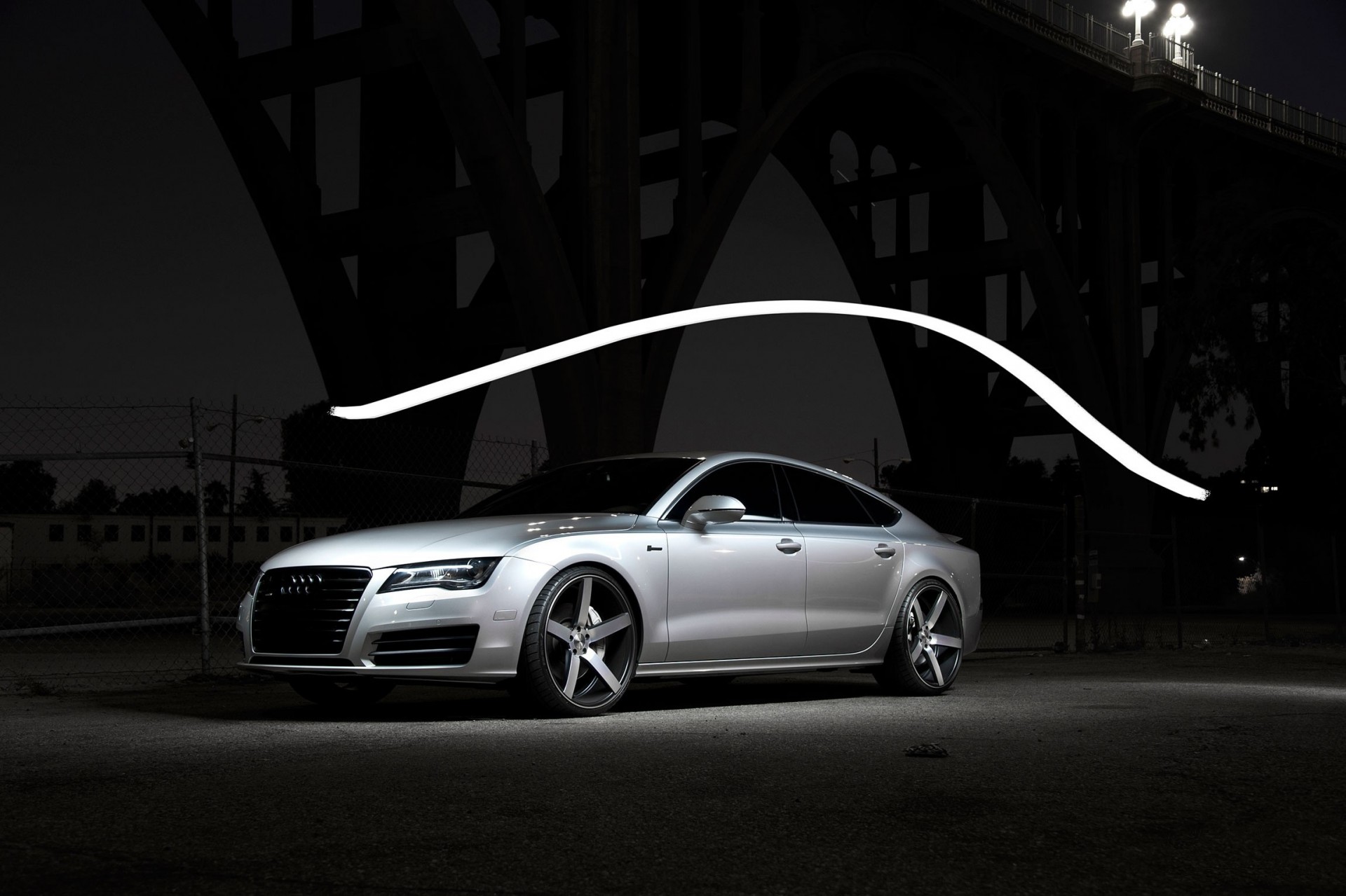 Foto nocturna de una motocicleta roja y un auto plateado con faros encendidos