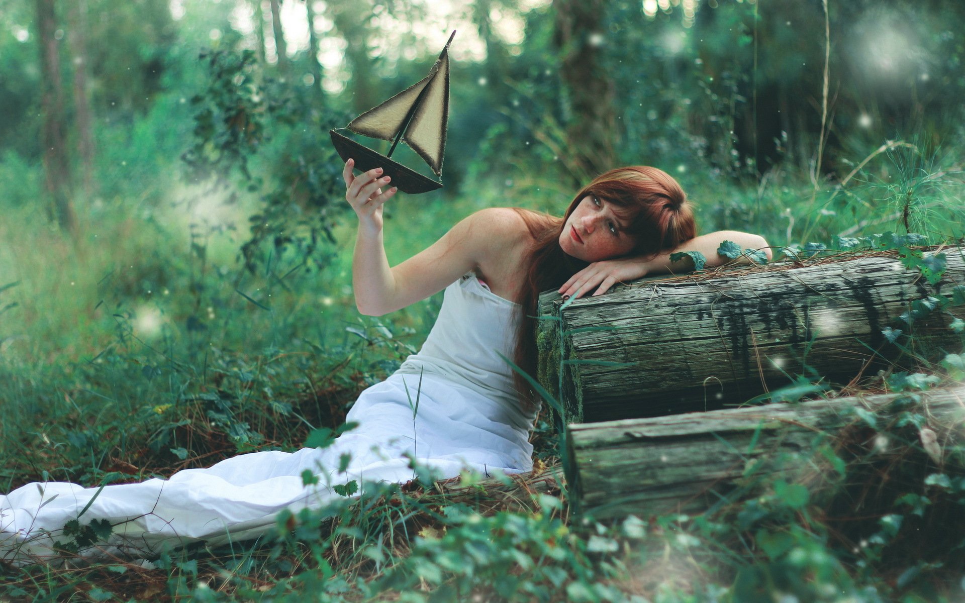 Chica con un barco en el fondo del bosque