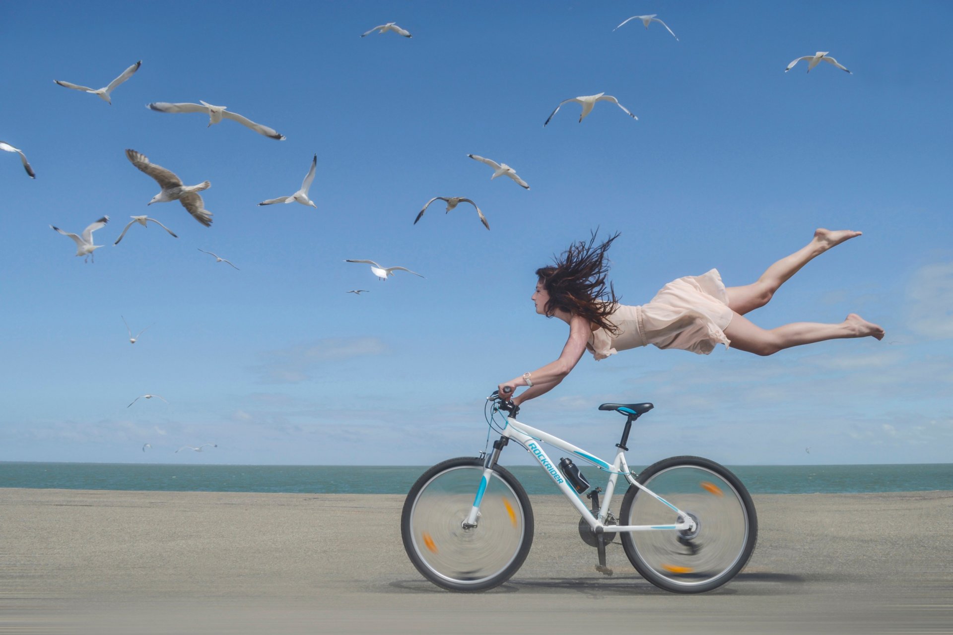 Una niña vuela sobre una bicicleta en la orilla del mar con gaviotasUna niña vuela sobre una bicicleta en la orilla del mar con gaviotas