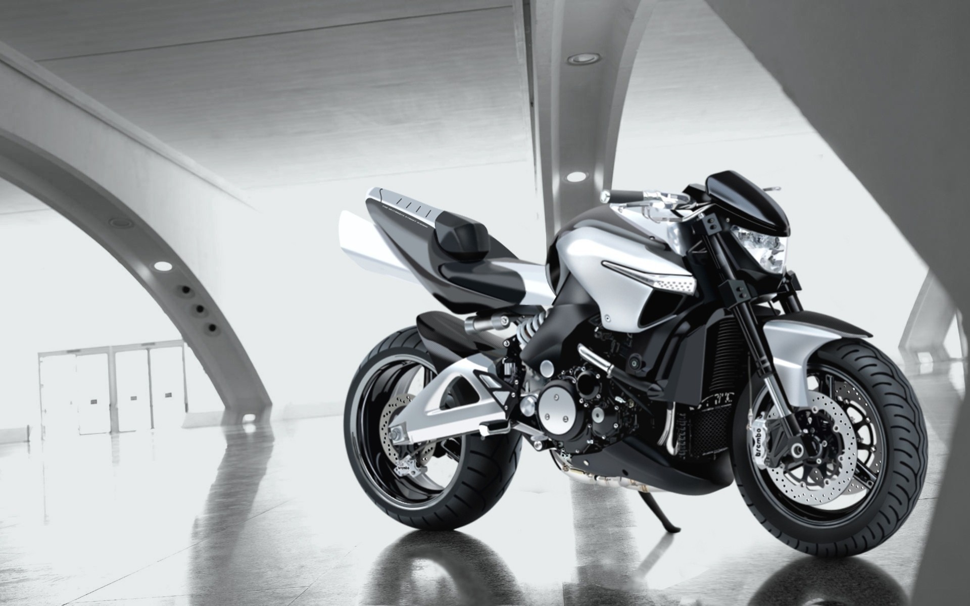 Hermosa moto grande de plata y negro sobre un fondo futurista