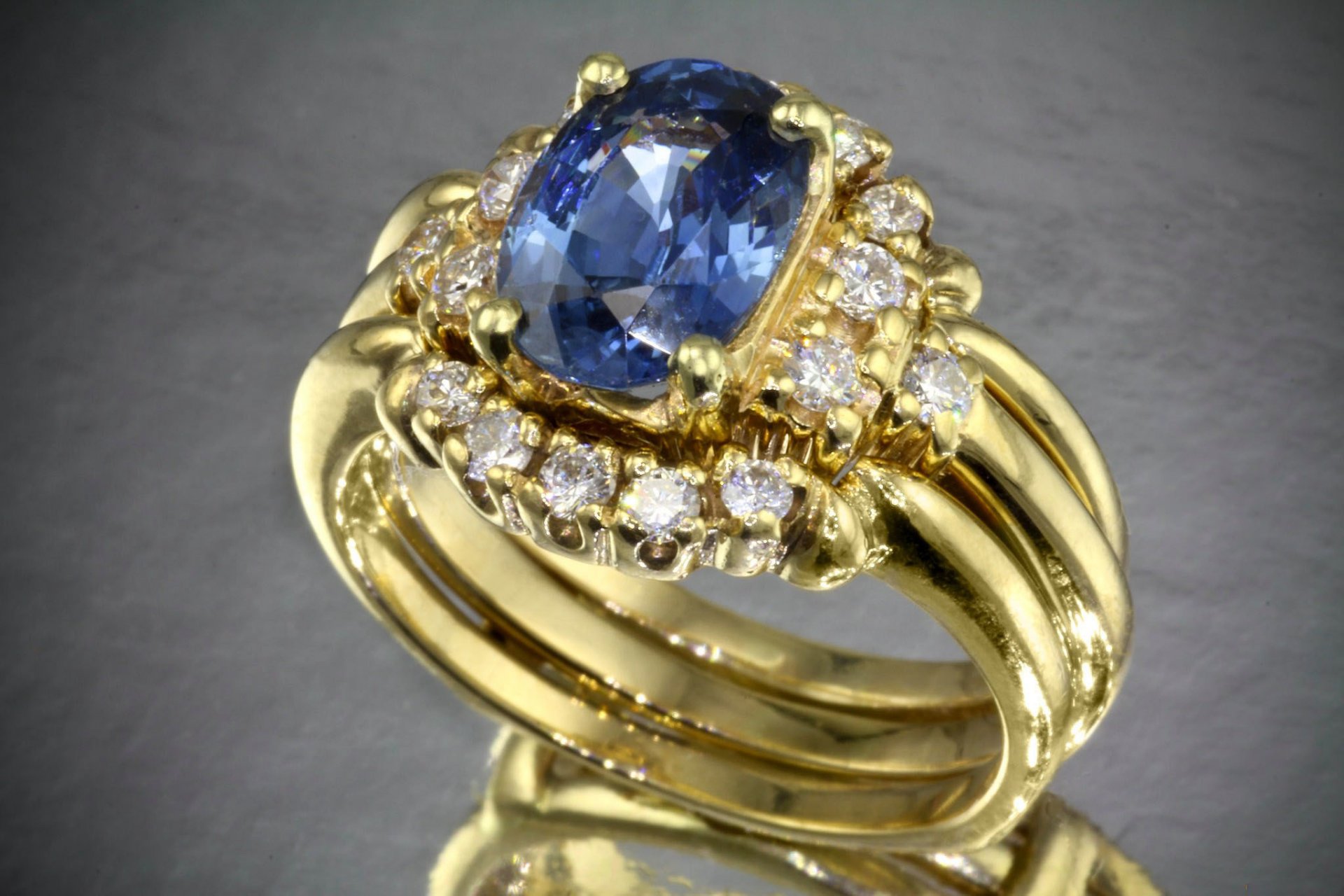 Anillo de oro con piedra azul grande y diamantes sueltos