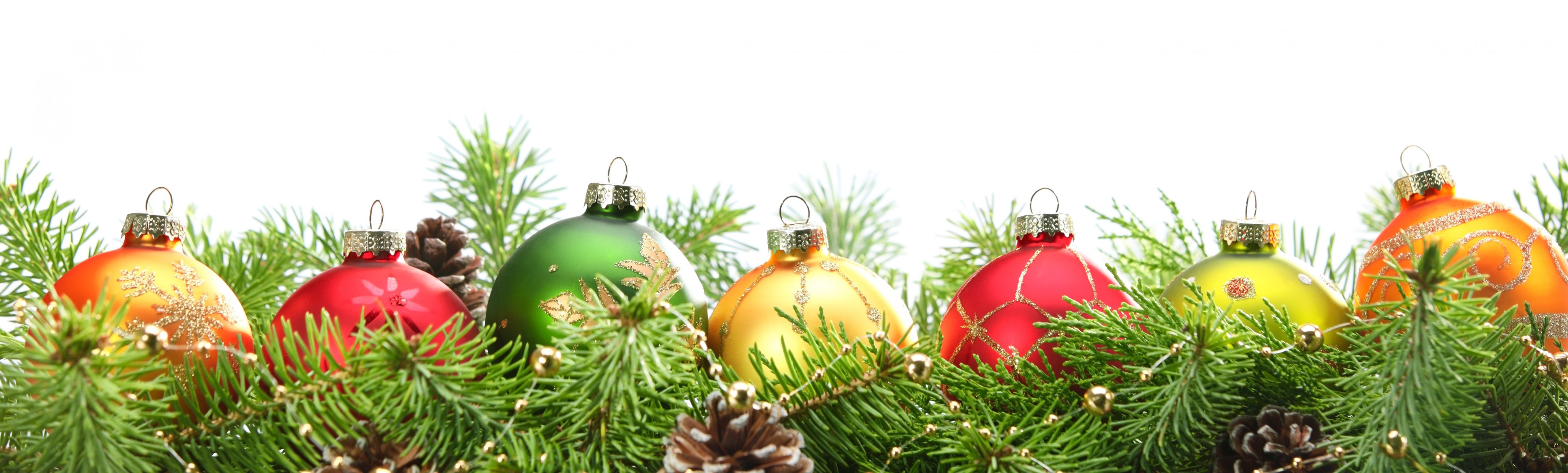 Bolas de colores de año nuevo que se encuentran en una fila en las ramas de abetoBolas de colores de año nuevo que se encuentran en una fila en las ramas de abeto