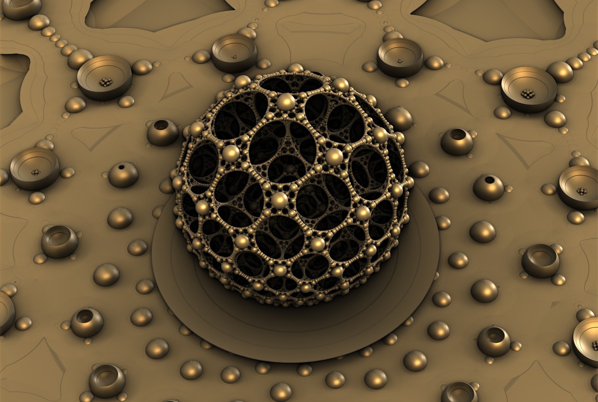 Una gran bola de oro y negro está rodeada de cucharas de oro