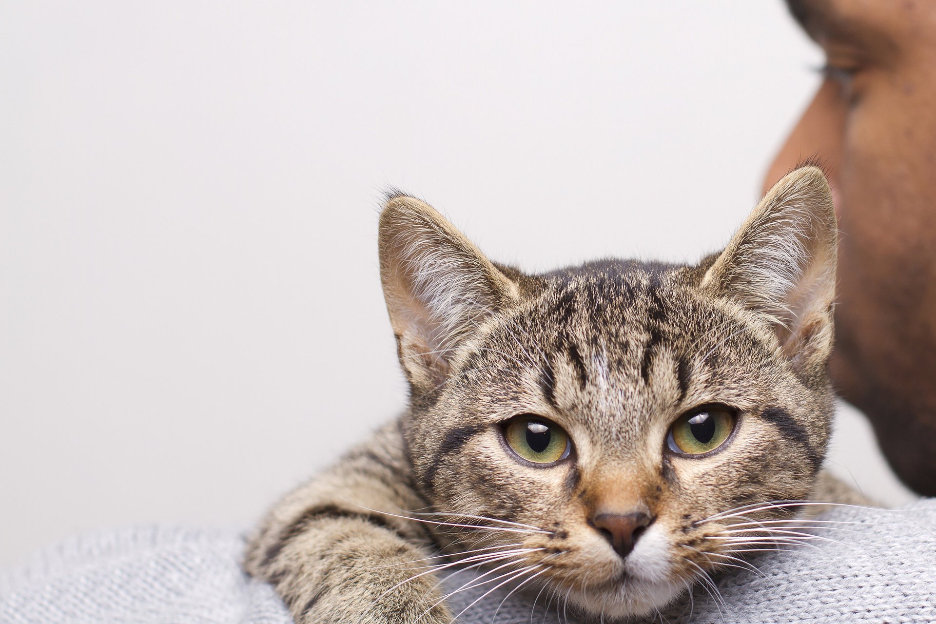Gato gris yace en el piso gris con el hocico hacia arribaGato gris yace en el piso gris con el hocico hacia arriba