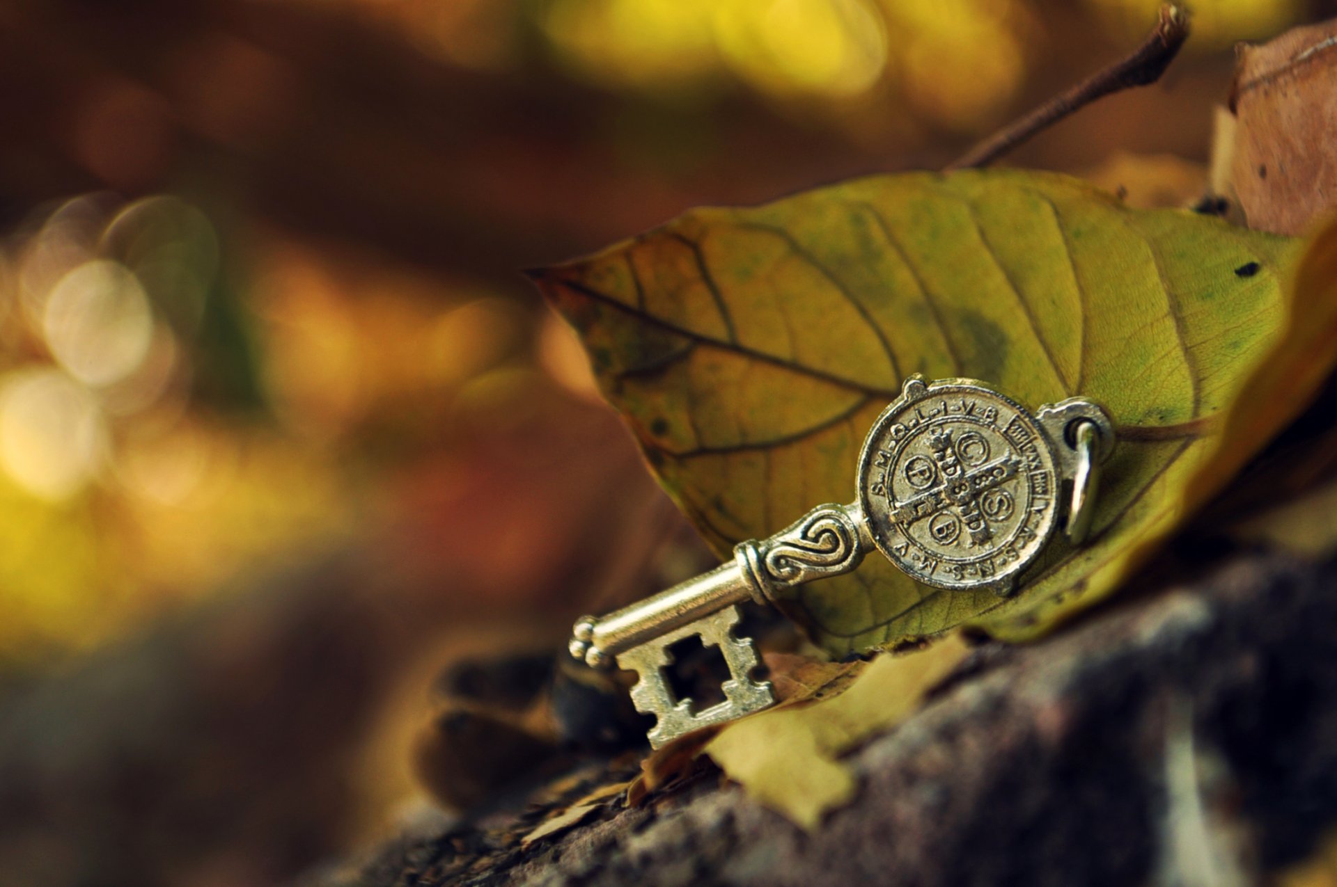 Llave de cabeza de metal en el follaje