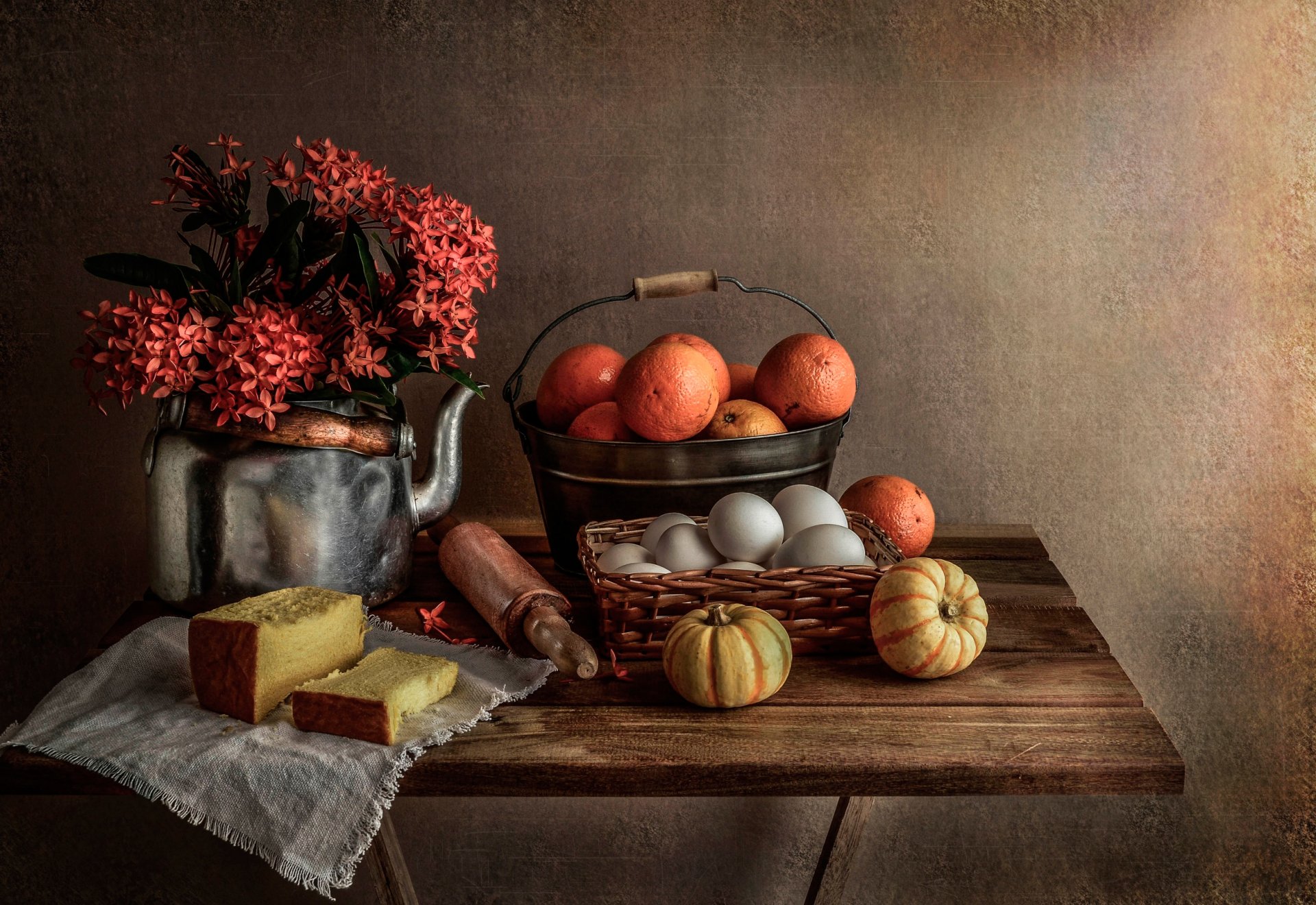 Bodegón flores en Tetera, pan, naranjas y calabazas