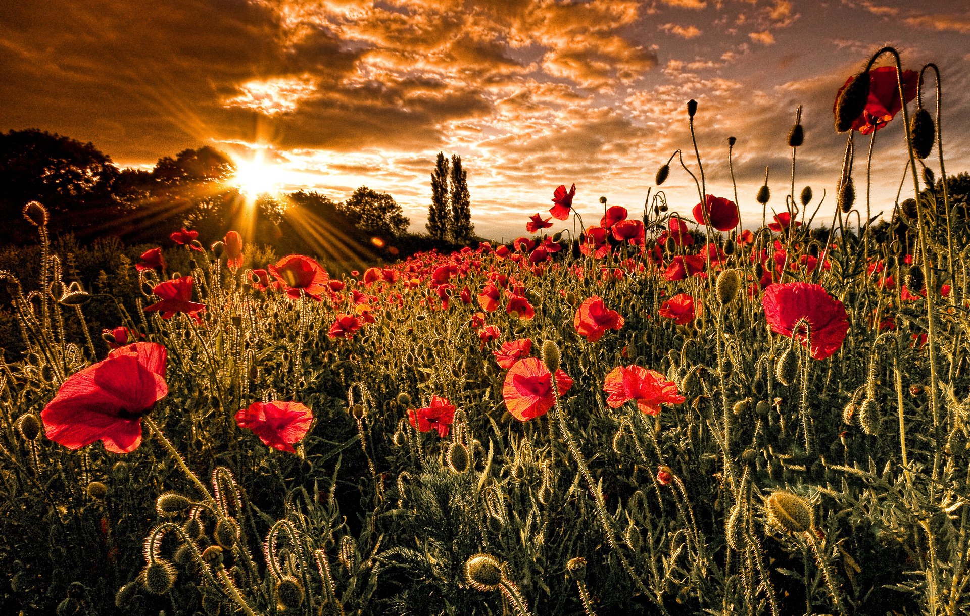 El sol se despide antes del atardecer con un campo de amapola escarlataEl sol se despide antes del atardecer con un campo de amapola escarlata