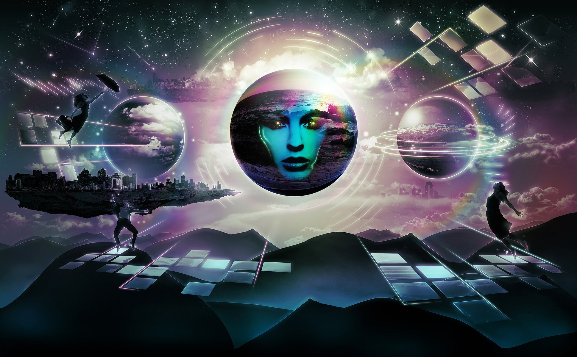 En el espacio cyberpunk ciudad planeta con cara de mujerEn el espacio cyberpunk ciudad planeta con cara de mujer