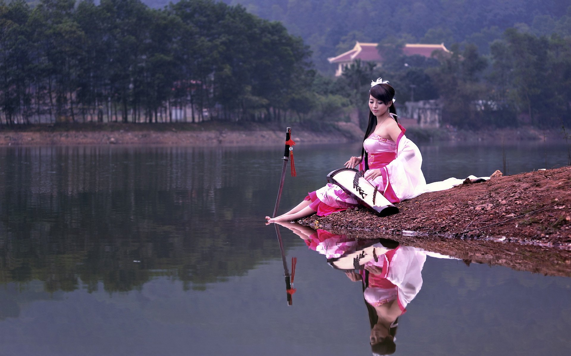 Un ejército con lanzas en el horizonte detrás del lagoUn ejército con lanzas en el horizonte detrás del lago