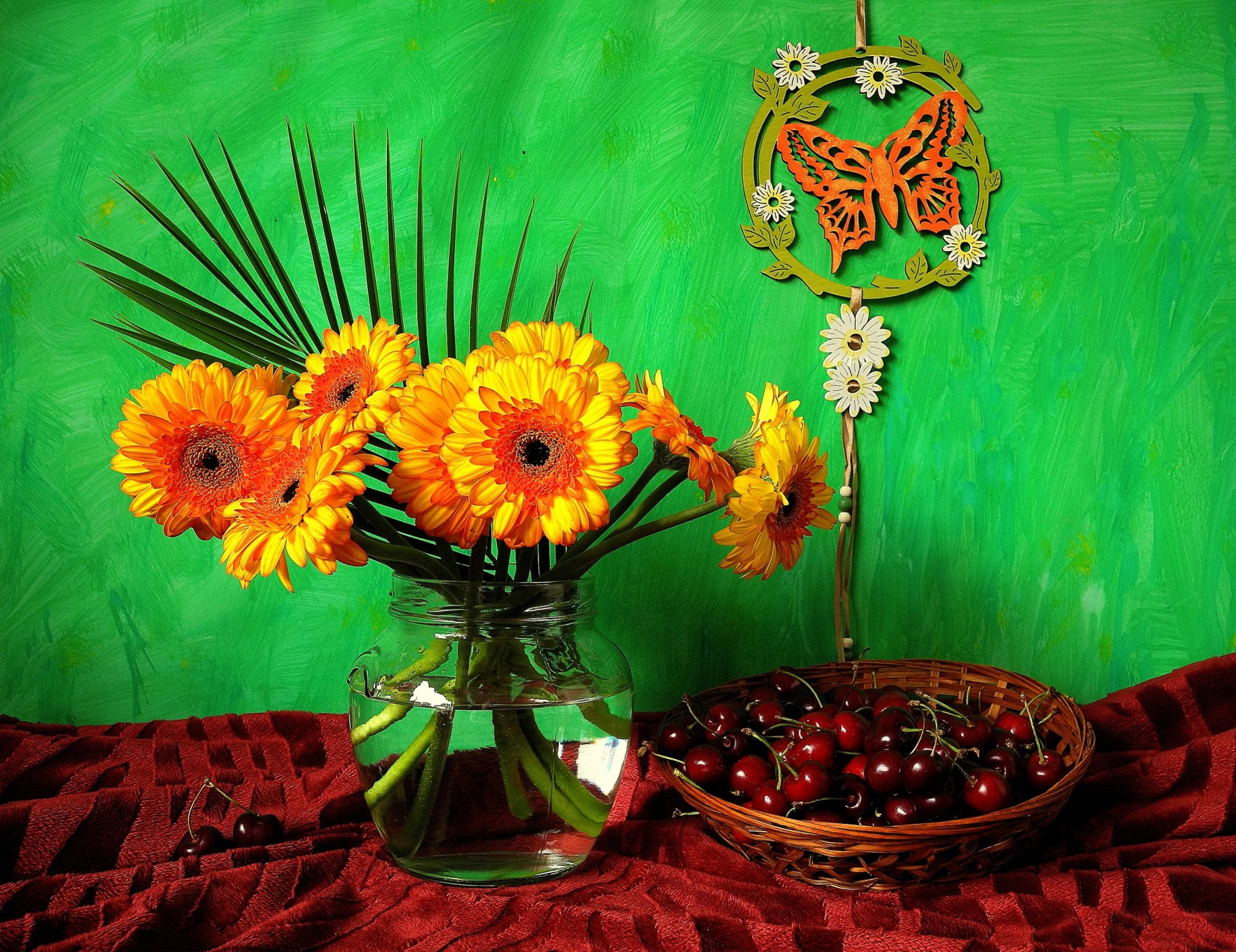 Puesta en escena de crisantemos y cerezas sobre un fondo verdePuesta en escena de crisantemos y cerezas sobre un fondo verde