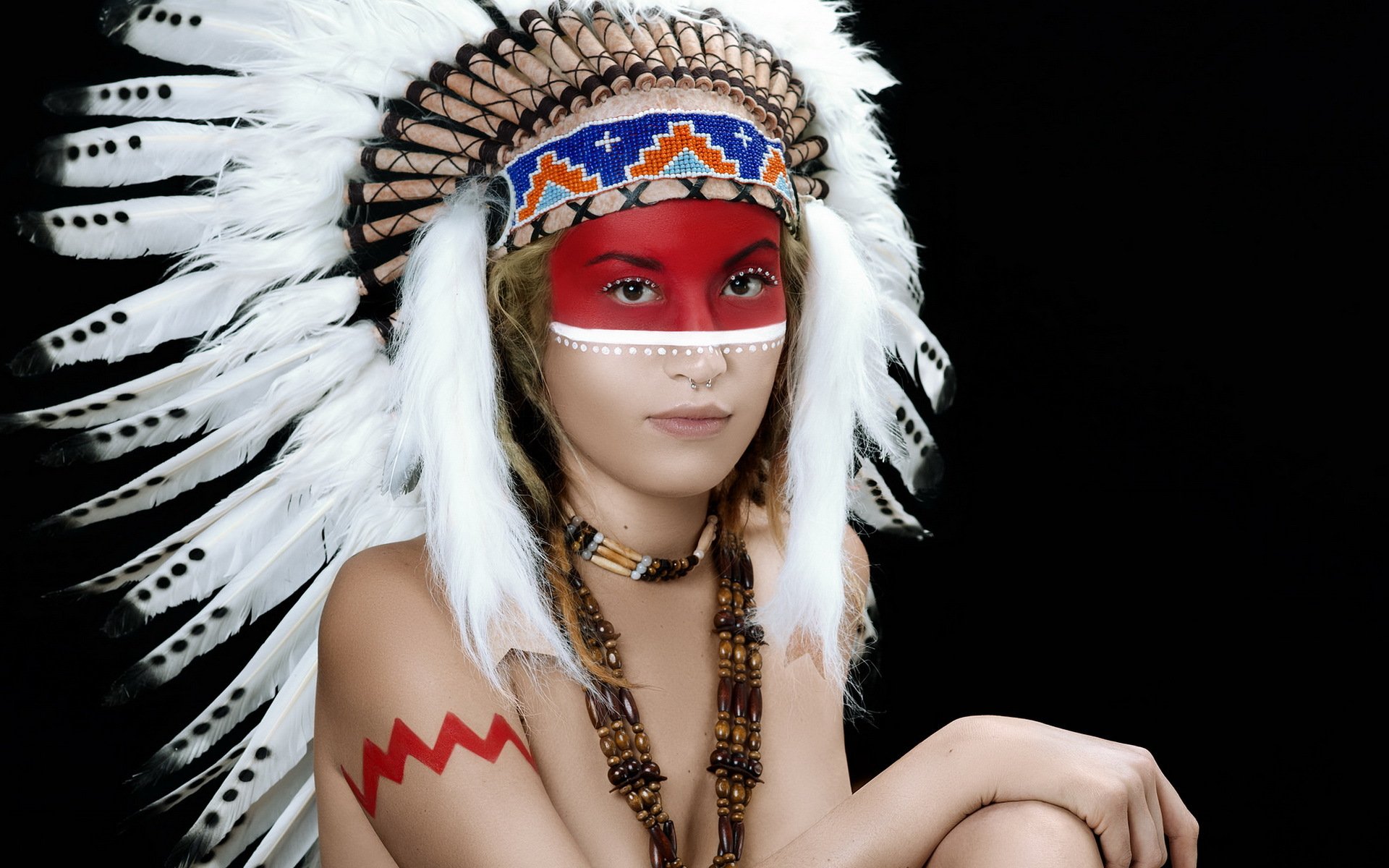 La cara de la chica mirando hacia abajo con un hermoso maquillaje de ojos y labios en un tono azul amarillento