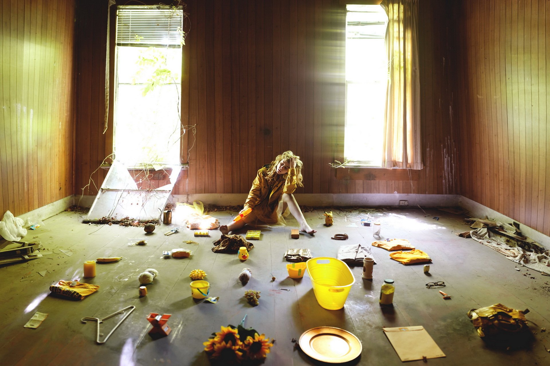 Chica con cabello ondulado amarillo y lazo en una habitación con un lío y ventanas abiertasChica con cabello ondulado amarillo y lazo en una habitación con un lío y ventanas abiertas