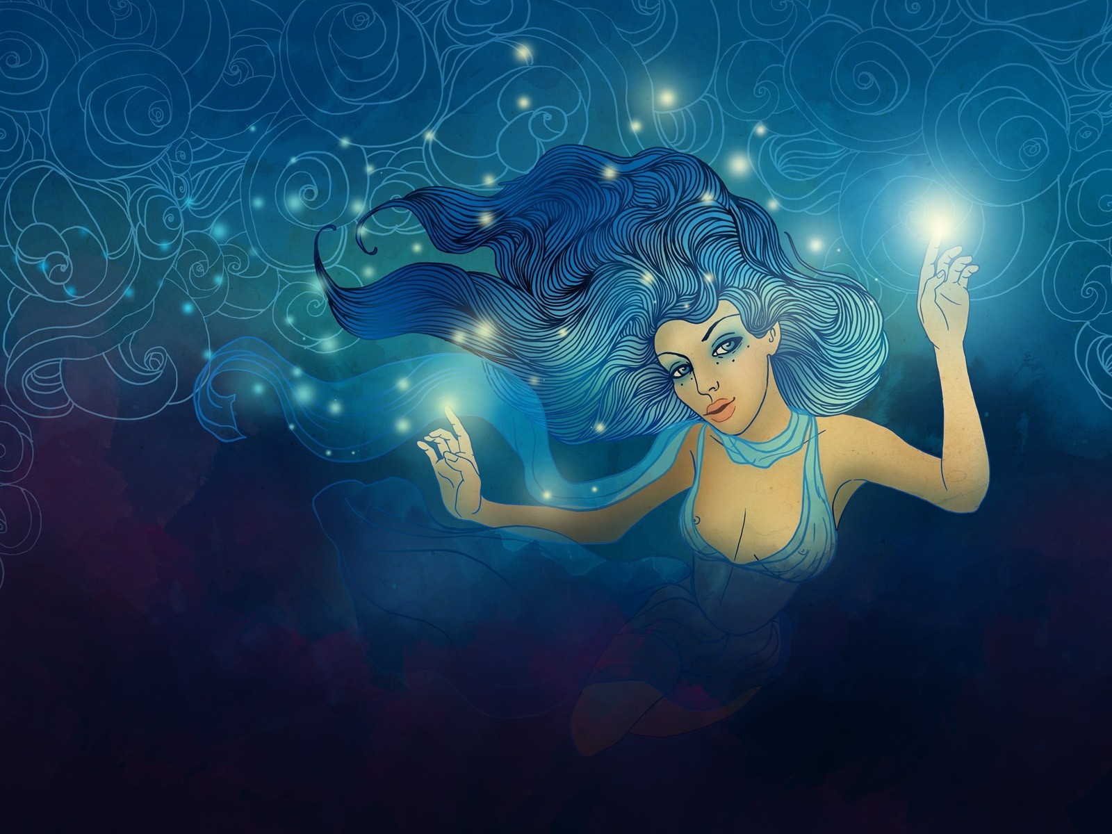 Fantasía, chica con el pelo largo, arroyo bosque noche luciérnagas